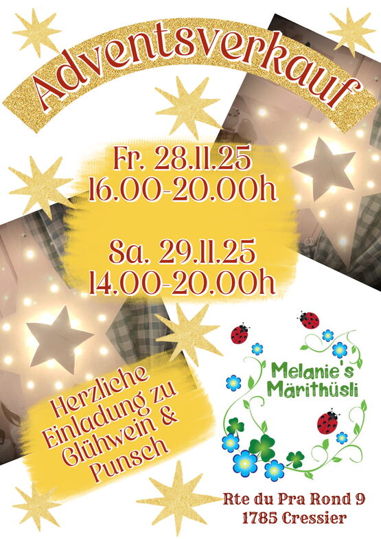 Brauchtum Adventsverkauf in Cressier von unsereRegion Nicht verpassen Wo? 1785 CressierRte du Pra Rond 9 Wann? Freitag, 28. November 2025 – Samstag, 29. November 2025 0 Facebook Twitter Whatsapp E-mail Datum und Zeit: 28.11.2025 16:00 - 20:00 29.11.2025 14:00 - 20:00 Verpflegung: Glühwein & Punsch