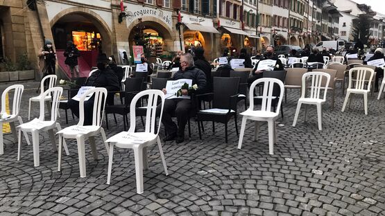 Die Betreiber der regionalen Restaurants und Lokale setzten sich heute Morgen um acht Uhr mitten im Stedtli auf einen Stuhl. Sie hielten jedoch keine Menu-Karten und Besteck in den Händen, wie normalerweise ihre Gäste, sondern eine weisse Rose und ein Plakat mit der Aufschrift «Lasst uns arbeiten».