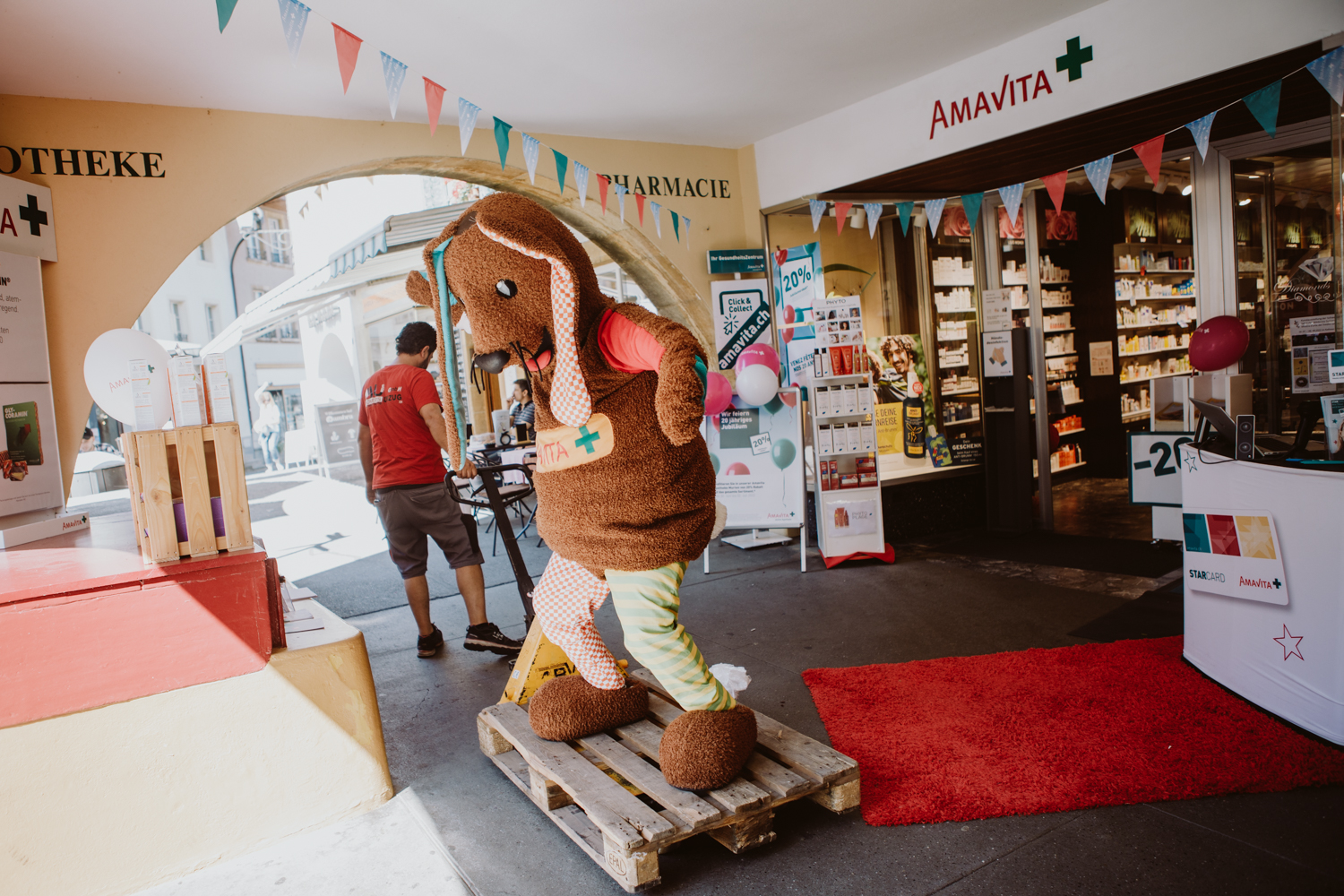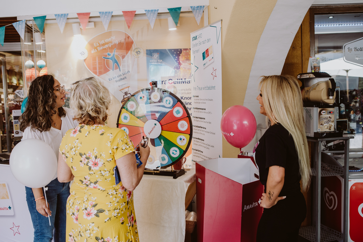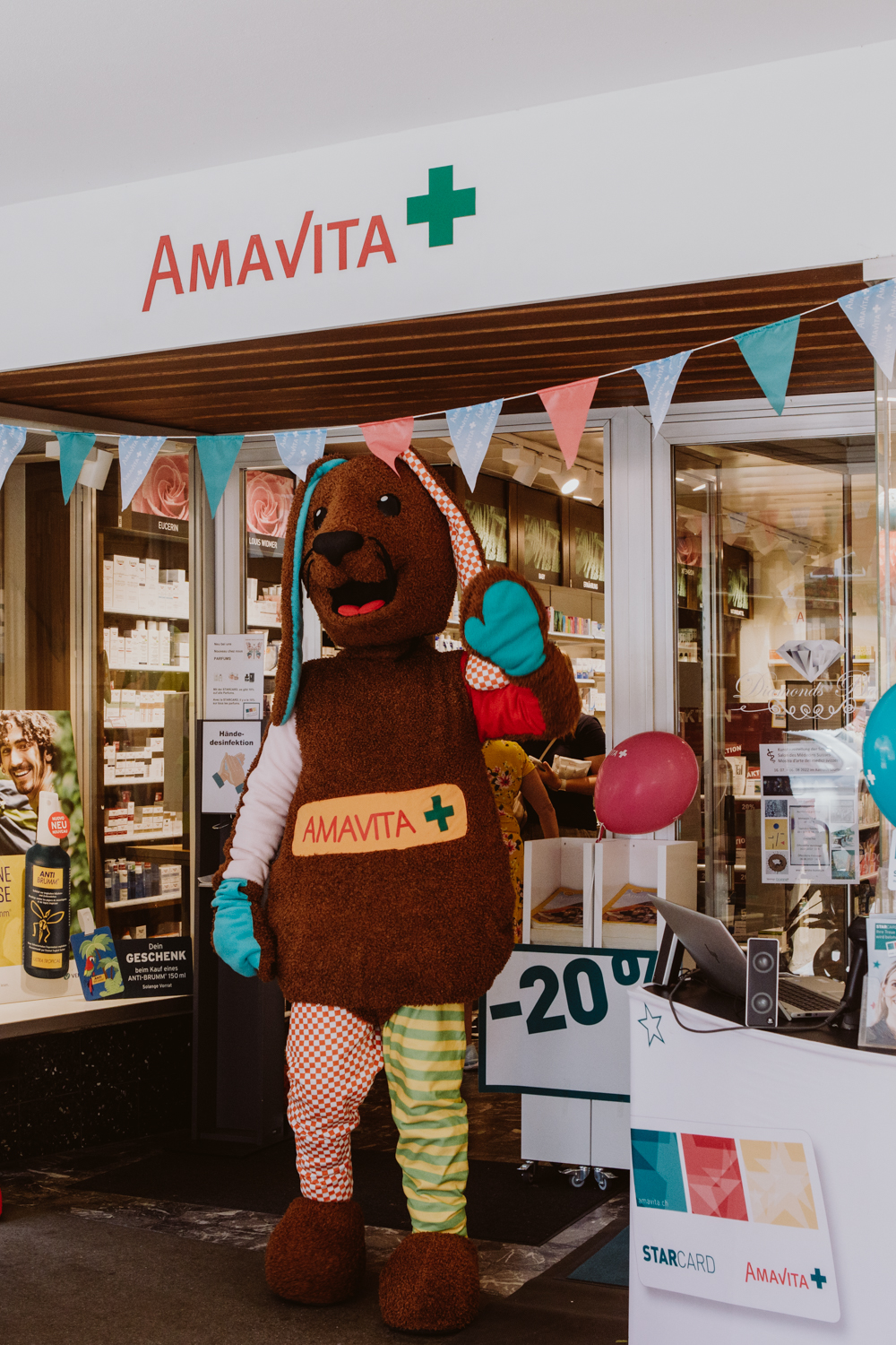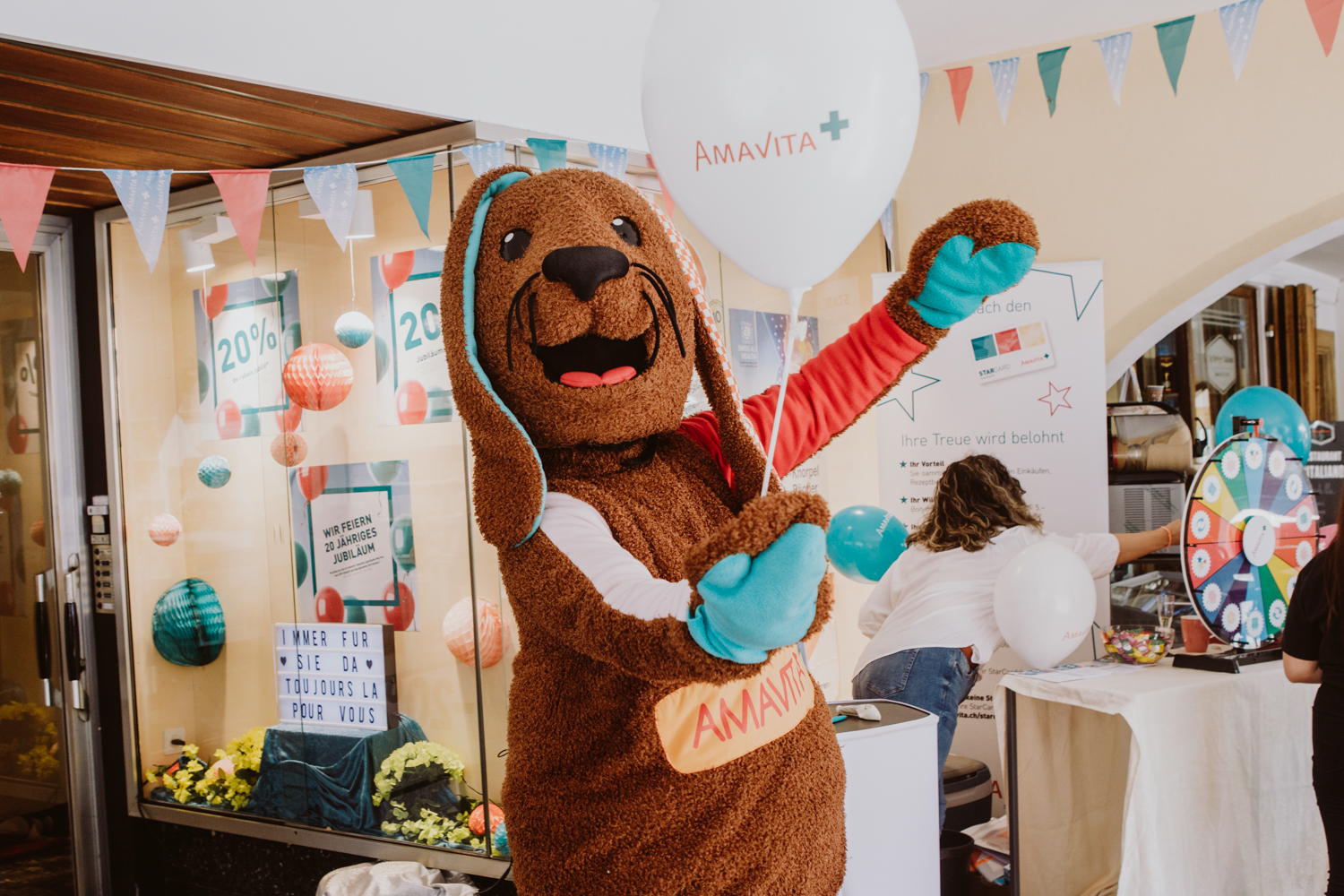 Zum Jubiläum ist der rote Teppich ausgerollt, das lebensgrosse Maskottchen Amalino bietet den Vorbeigehenden Traubenzucker, Rivella, Wasser und sogar Prosecco an und lädt ein, das Glücksrad zu drehen. Wer am Rad dreht, kann – mit Glück oder Geschick – Prozent-Gutscheine gewinnen oder darf sich etwas aus der Überraschungsbox auswählen.