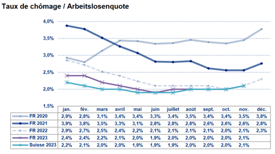 Im November 2023 verzeichnete der Kanton Freiburg 7558 Stellensuchende. Dies sind 457 Personen mehr als im Oktober 2023 und 73 Personen mehr als im November 2022. Die Stellensuchendenquote liegt neu bei 4,4 Prozent (+0,3 Prozentpunkte). Im Landesdurchschnitt ist die Stellensuchendenquote gegenüber dem Vormonat um 0,2 Prozentpunkte auf 3,7 Prozent gestiegen.