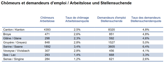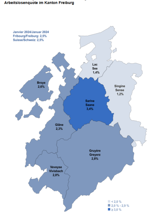 Der Kanton Freiburg verzeichnete im Januar 2024 eine Arbeitslosenquote von 2,5 Prozent. Dies sind 0,1 Prozentpunkte mehr als im Vormonat. Die Zahl der Arbeitslosen lag bei 4393 Personen. Das sind 286 Personen mehr als im Dezember 2023 und 179 Personen mehr als im Januar 2023. Die Arbeitslosenquote hat in fast allen Bezirken zugenommen und liegt neu bei 3,4 Prozent im Saane- (+0,3 Prozentpunkte), 2,8 Prozent im Greyerz- (+0,2 Prozentpunkte), 2,3 Prozent im Glane- (+0,2 Prozentpunkte), 2,8 Prozent im Vivisbach- (+0,2 Prozentpunkte) und 2,6 Prozent im Broyebezirk (+0,3 Prozentpunkte). Einzig im See- (1,4 Prozent) und Sensebezirk (1,2 Prozent) blieb die Quote gegenüber Dezember 2023 unverändert.