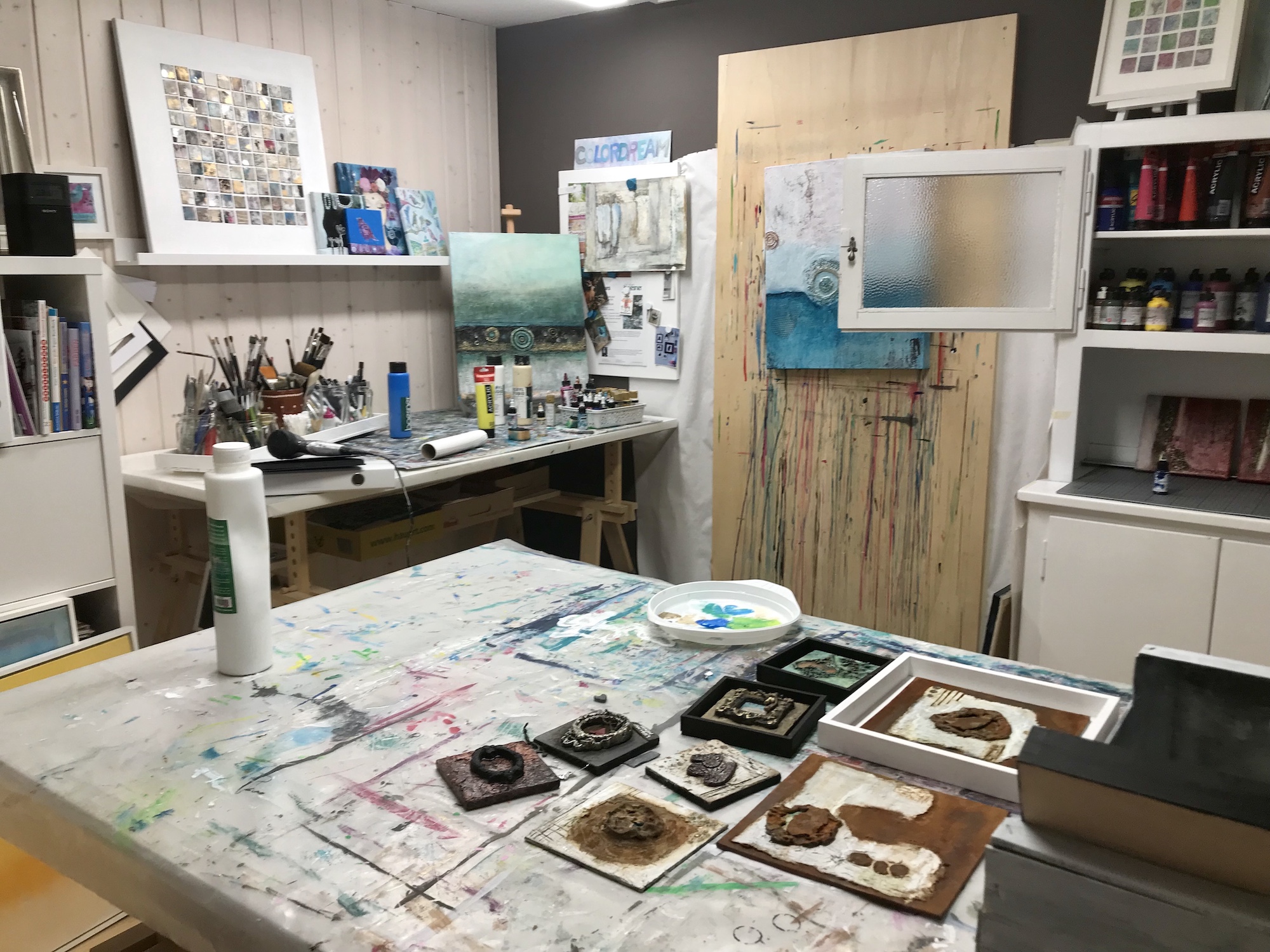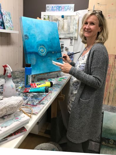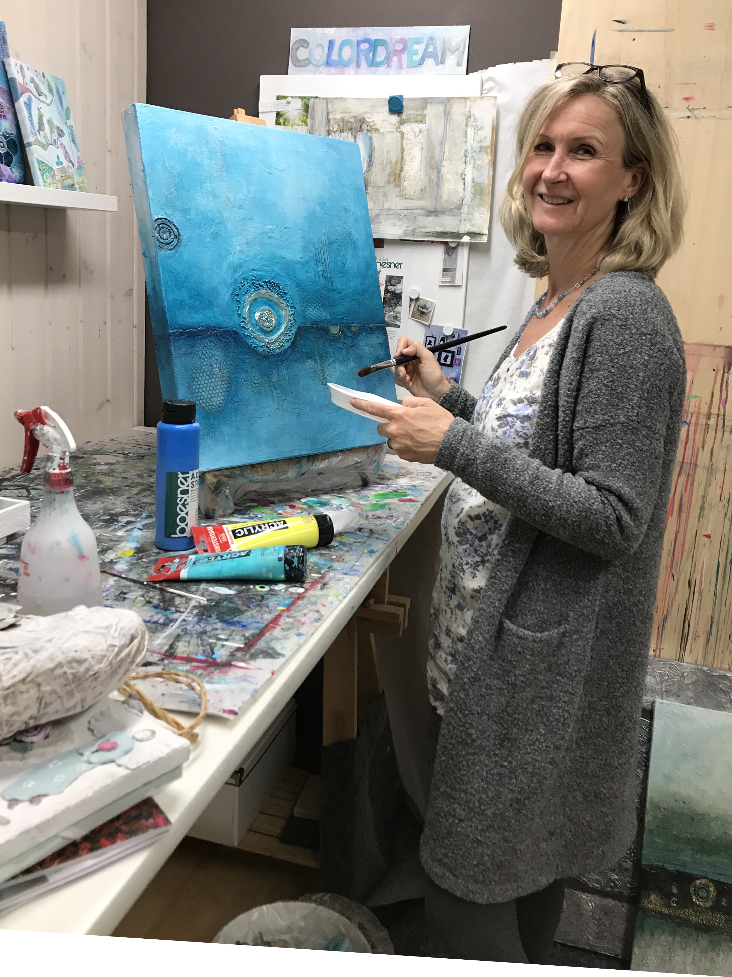Heute stelle ich Ihnen Géraldine vor. Wenn man ihr Haus betritt, wo sich auch Atelier und Kursraum befinden, laden Bilder und Skulpturen den Besucher zum Betrachten und Verweilen auf. Seit über zwanzig Jahren malt und modelliert Géraldine. Sie 'tüftelt' gerne mit Materialien und Techniken, probiert zum Beispiel mitten in der Nacht aus, was mit geschmolzenen Joghurtbechern alles machbar ist. Das Meiste hat sie sich selber beigebracht, unermüdlich und mit Fantasie immer wieder Neues ausprobiert. In Kursen gibt sie ihre Erfahrungen und ihr Wissen mit Leidenschaft weiter und die Freude ist gross, wenn sie den Samen der Kreativität bei einem der Teilnehmenden säen kann. Die Kurse sind für Géraldine eine zusätzliche Bereicherung, denn hier findet – für die sonst eher in der Stille und Abgeschiedenheit Schaffenden - Austausch und Begegnung statt.