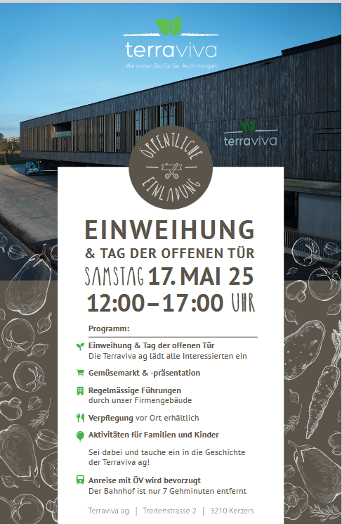 Die Terraviva AG öffnet am 17. Mai 2025 ihre Türen und freut sich, der interessierten Bevölkerung die Geschichte des Unternehmens sowie den neuen Gebäudekomplex vorzustellen.
