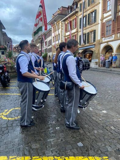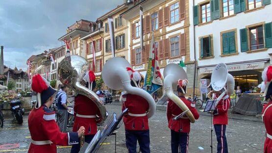 Was definitiv zur Soli gehört, ist die Stadtmusik. Das Ensemble unter der musikalischen Leitung von Dirigent Beat Weber war deshalb selbstverständlich auch dieses Jahr früh unterwegs: nämlich bereits um 5 Uhr morgens, pünktlich zur Tagwache. Da es um diese Zeit in Strömen regnete, spielte die Stadtmusik beim Monnier unter den Lauben. Danach ging es weiter in den Schlosshof, wo die Musiker*innen traditionell von der Oberamtsperson empfangen werden. Die Präsidentin der Stadtmusik Murten, Manuela Gumy, erzählt: «Dieses Jahr haben wir Daniel Lehmann und seiner Frau unseren aufrichtigen Dank ausgesprochen für die 25 Jahre, in denen sie uns im Schlosshof mit einem herzlichen Apéro empfangen haben.» Merlachfeld, Vissaulastrasse, Louis d’Affry-Weg und die Pestalozzistrasse waren die nächsten Stationen, wo die Stadtmusik den Start des Festes verkündete. Den Schluss bildete das Bahnhofsbuffet, wo die Musiker*innen dann ein Morgenessen genossen. Auch dies hat bereits Tradition bei der Stadtmusik.