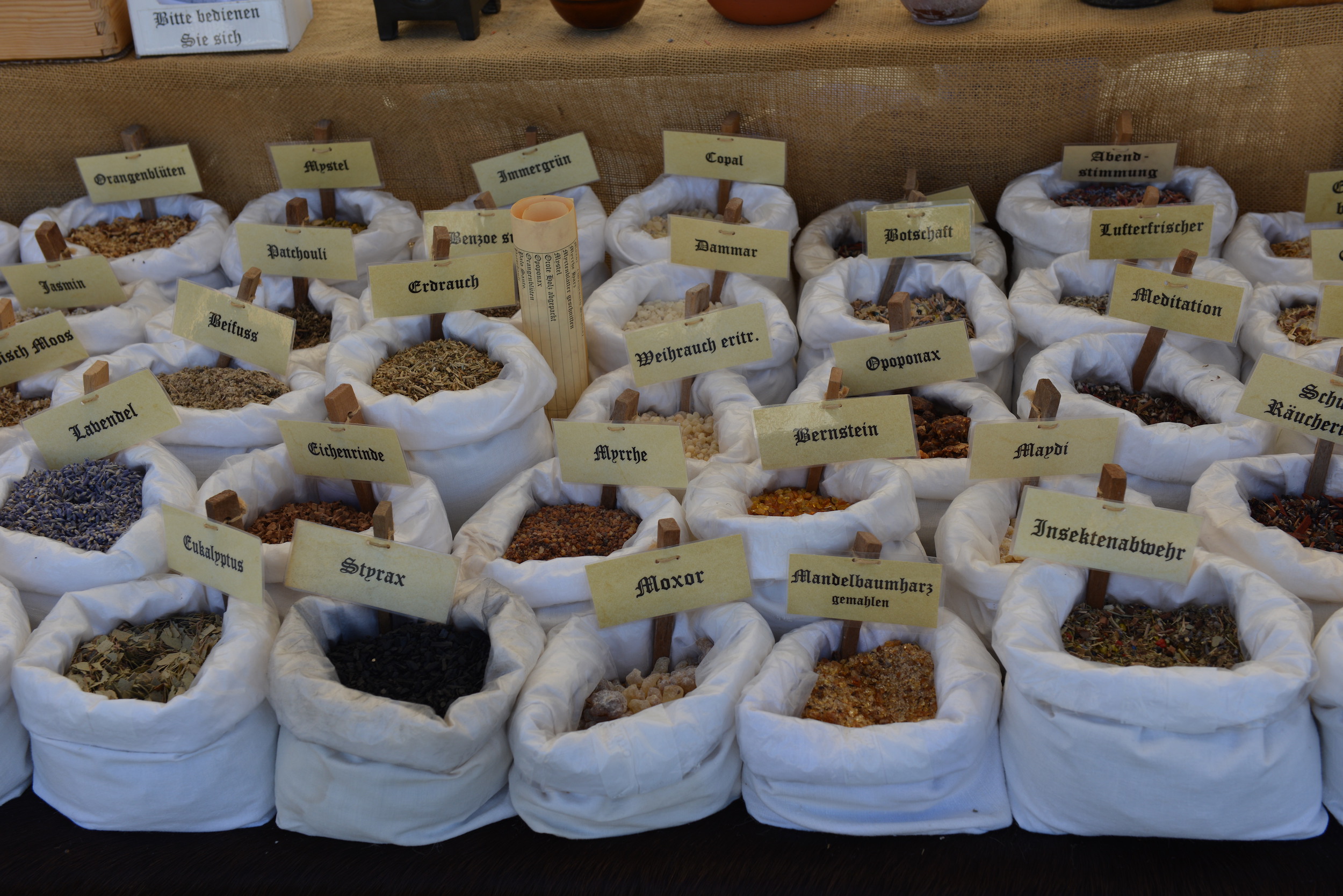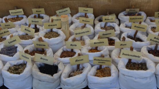 Ruhiger und geselliger geht es auf dem grossen Marktgelände zu und her. Zahlreiche Händler aus aller Welt bieten im Schlosshof und im Schlosspark ihre Waren feil. Aber auch der Geschichtenerzähler im Märlizelt, der Zauberer auf dem Markt oder die Gaukler auf der Bühne lassen den Puls der Besucher höherschnellen.