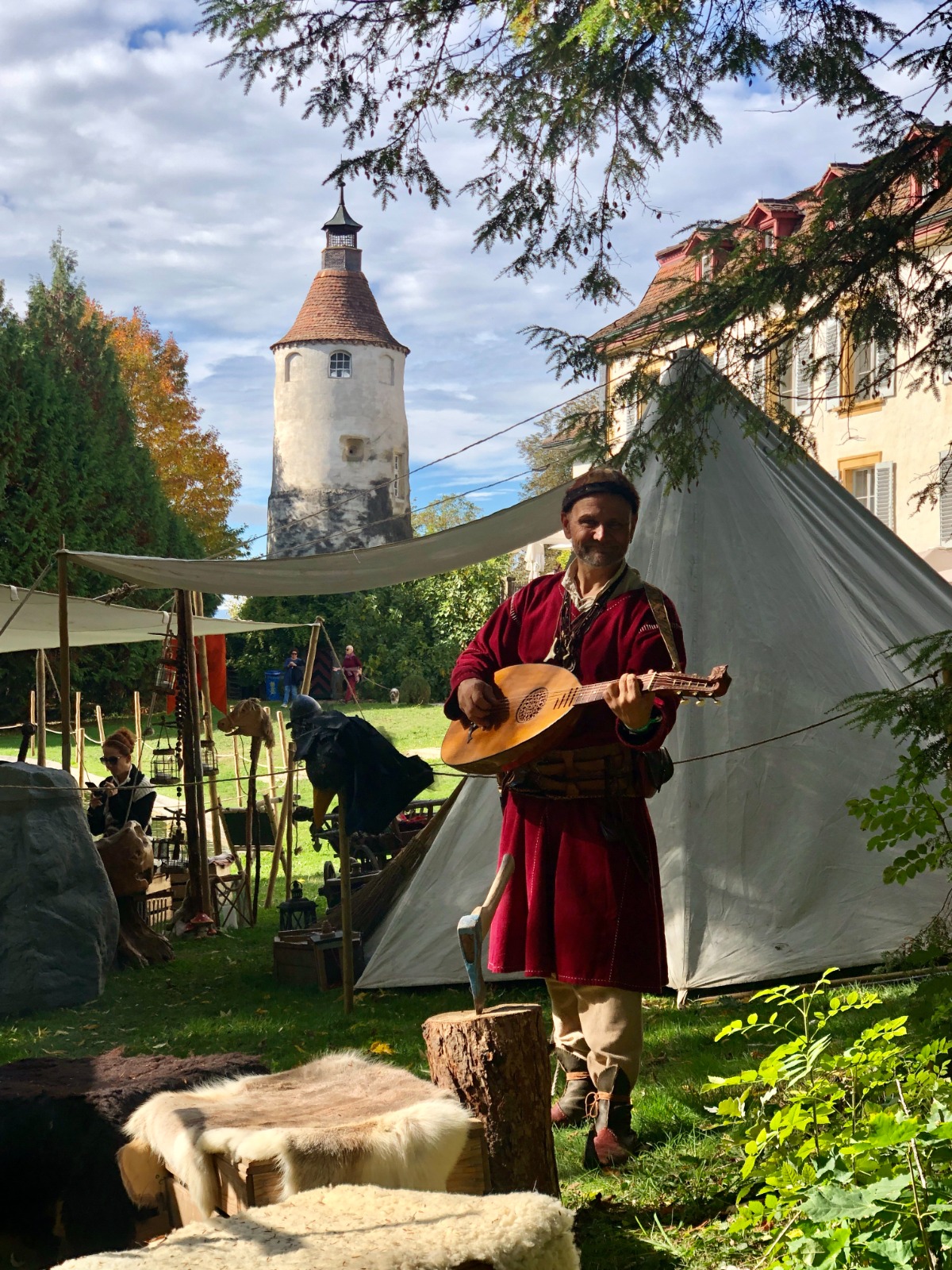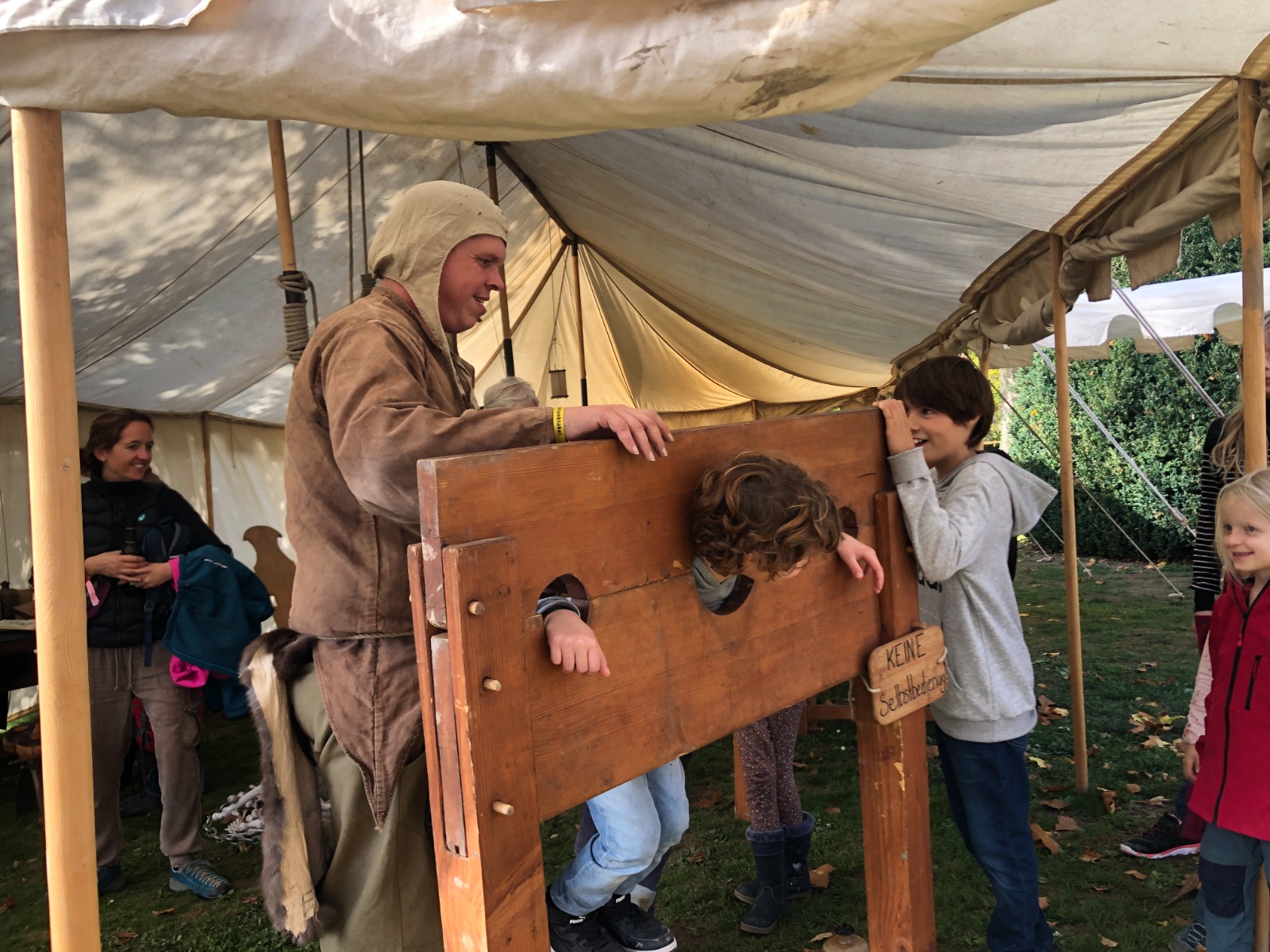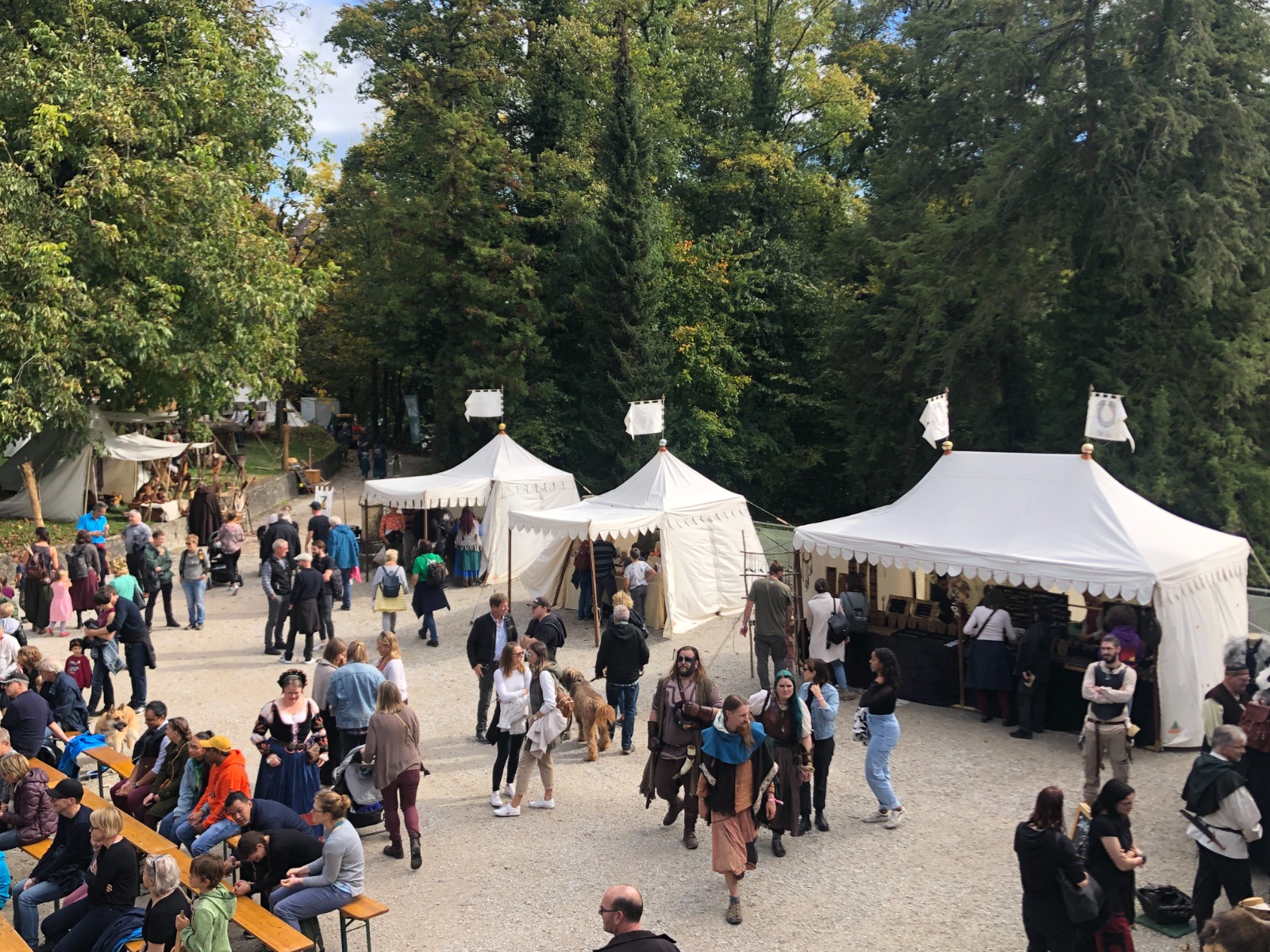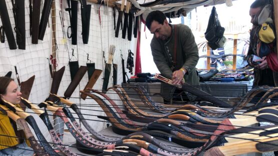Neben den wichtigen Programmpunkten, dem Ringen der bewaffneten Ritter um den Sieg und die Gunst des Publikums, hielten unzählige Marktleute ihre Ware feil: Schmuck und Waffen, Trinkbares und andere Köstlichkeiten. Marktbesucher*innen mit einem reinen Gewissen und einer sauberen Weste durften sich gar probehalber den verschiedensten mittelalterlichen Foltermethoden hingeben.