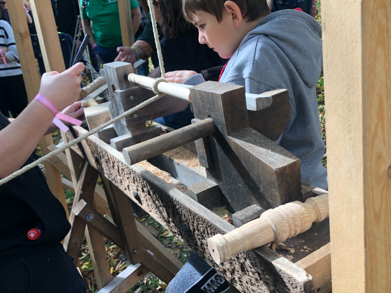Manche junge Waffenträgerin und zahlreiche kleine Knappen durften ihren ersten Schwertstreich ausführen. Aber auch Einblick in verschiedene alte Handwerke wurde geboten. Und nicht selten staunte man, dass wir auch vieles ohne motorisierte Maschinen könnten. Etwa Drechseln mit einer Drehbank mit Fusspedal.