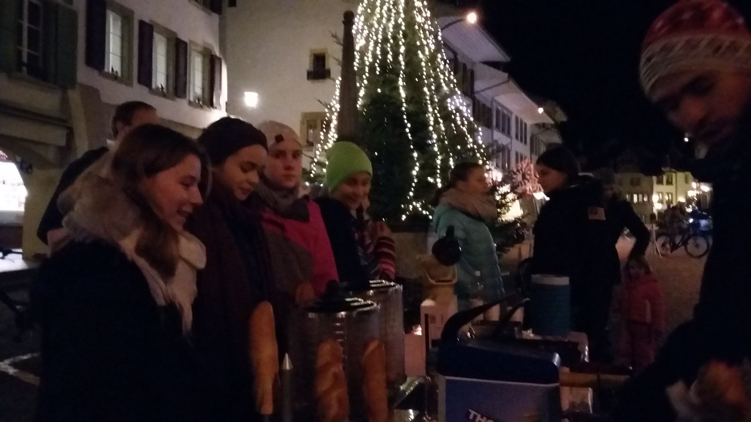 Das aufgeregte Plappern und Lachen der Kinder wies mir den Weg zur Pferdekutsche, den beiden Schmutzlis und dem rotgewandeten Samichlaus. Ungeduldig warteten die Kinder an der Hand von Eltern, Tanten oder Grosseltern darauf, in der Reihe vorzurücken und dem Samichlaus persönlich zu begegnen. Ein paar Kinder hörte ich ein letztes Mal ihr Verslein üben, andere hüpften aufgeregt auf und ab, hie und da weinte ein Kind – ob aus Langeweile oder Angst weiss ich nicht. Wem das Warten zu lang wurde, konnte sich mit Punsch, Hot Dog oder Schoggi-Küchlein die Zeit verkürzen. Feilgeboten wurden Speis und Trank von geschäftstüchtigen OS-Schülern, die so ihre Reisekasse aufbessern.