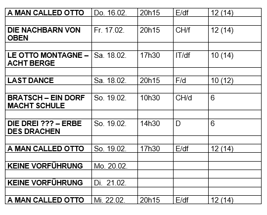 «Die Nachbarn von oben», «Last Dance» und «Ennio Morricone – Il Maestro» (am 1.3.). Für die Kinder wird am Sonntagnachmittag neu der Kinderfilm «Die drei ??? – Erbe des Drachen» gezeigt.