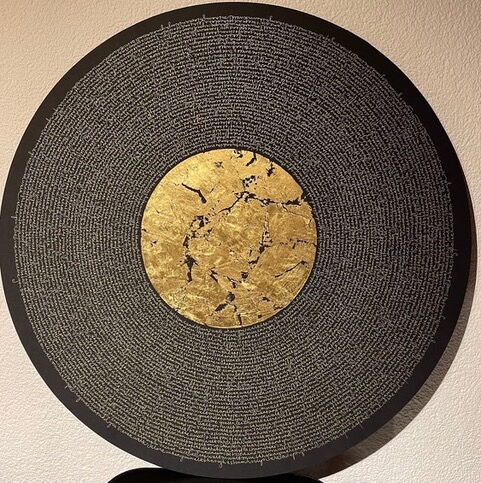 Die Betrachtenden sehen Kreise, goldene Weltenkugeln,- eingebettet in verschlungen faszinierenden Schriftzügen- tausend verschiedene Worte, Sätze und doch so klar Mitte, die in die Tiefe geht und berührt. Die Künstlerin umschreibt und umkreist diese echt-goldenen Mitten mit ihrer wunderschönen Handschrift in regelmässigen, ruhigen Schriftzügen und auf Wunsch auch mit den ganz eigenen Worten der künftigen Bildbesitzer*Innen.