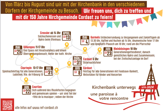 Die reformierte Kirchgemeinde Cordast wird in diesem Jahr 150 Jahre alt. Das Jubiläum feiert sie im gesamten Kirchengebiet. Dazu verlässt eine Kirchenbank das Kirchengebäude in Cordast und reist von Dorf zu Dorf. Rund um diese Kirchenbank finden Aktivitäten statt.