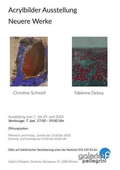 Gleich zwei Künstlerinnen stellen im Juni in der Galerie Pellegrini aus: Christine Schmidt und Fabienne Delavy, wohnhaft im freiburgischen Vully. Seit zehn Jahren verbindet die beiden eine Freundschaft, die ihre Wurzeln im regen Austausch über kreatives Schaffen und in der malerischen Kunst hat.