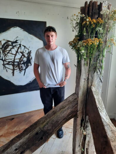 10 / 17BildergalerieLars Luginbühl, Bern, neben zwei seiner Werke -Connection Lost- aus Einsenbahnschwellen, Draht und Pflanzen und -Untitled- -