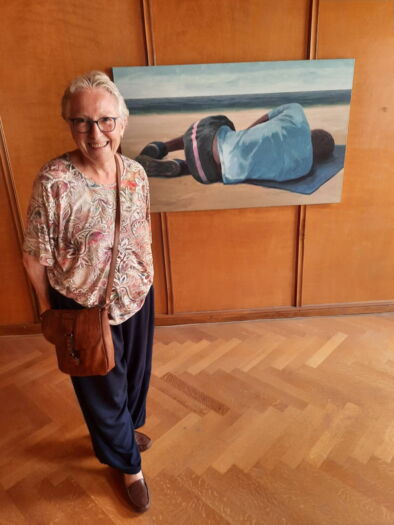2 / 17BildergalerieJohanna Maurer, Murten, vor dem Gemälde von Wojtek Klakla - Freie Sicht aufs Mittelmeer -