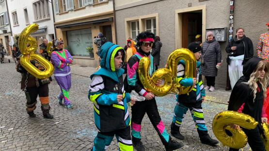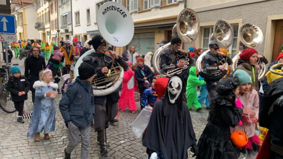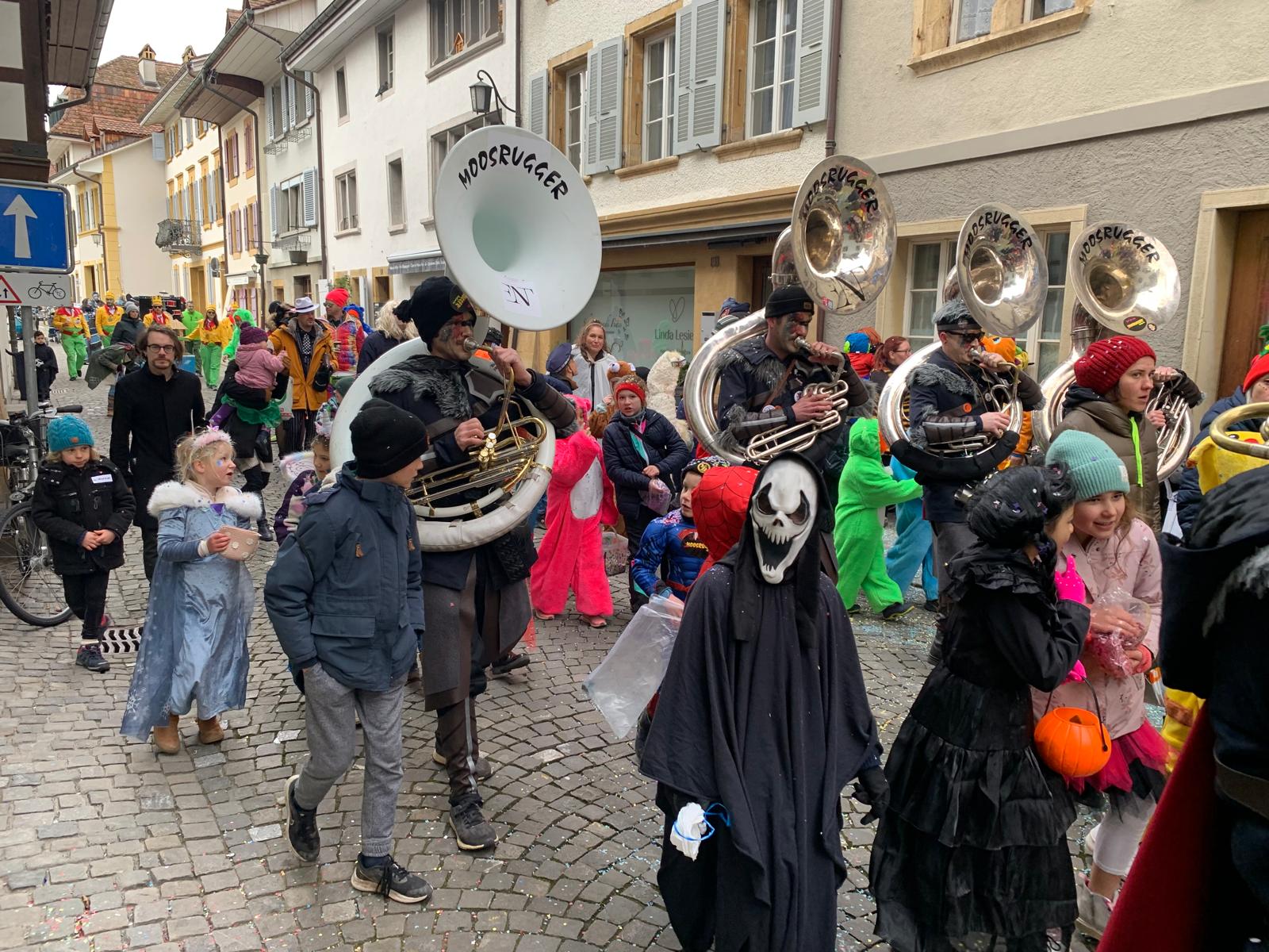 Der anschliessende Kinderumzug war gespickt von Guggenmusik Gruppen, ein beachtlicher, langer Umzug durch die Gassen, gesäumt von vielen Zuschauern und maskierten Fastnachtsfamilien. Der Umzug endete schliesslich in der Mitte der Hauptstrasse, wo die Schlüsselübergabe und Proklamation zur Eröffnung der Fastnacht stattgefunden hat.