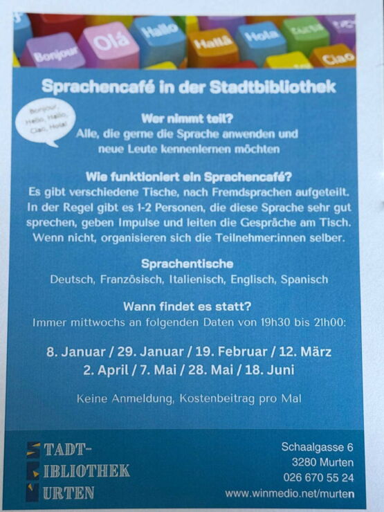 Auch ältere Menschen besuchen die Stadtbibliothek Murten gerne, um den Kontakt mit Gleichgesinnten zu pflegen und gleichzeitig in einer anderen Sprache auszutauschen. Fremdsprachige Besucher:Innen sind auch willkommen, so können sie ihre Deutschkenntnisse vertiefen und gleichzeitig trägt das Treffen einiges zur Integration mit der hiesigen Bevölkerung bei. Wichtig ist, dass man sich einigermassen in der anderen Sprache ausdrücken kann, um dem Gespräch am jeweiligen Sprachentisch folgen zu können.