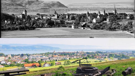 Was folgte war in der Tat eine Stadtführung ins Murten einer vergangenen Zeit. Beginnend mit der Umgebung von Murten und einem Blick vom Hügel Bodenmünzi auf Murten (siehe Foto unten). Die Saia war erst gerade noch im Begriff gebaut zu werden und die Quartiere Engelhard- und Visaulastrasse noch in weiter Ferne. Das Bahnhofbuffet hatte noch eine Outdoor-Kegelbahn auf dem Gelände wo heute die Post steht. Und das Quartier Schützenmatte war noch eine richtige Schützenmatte.