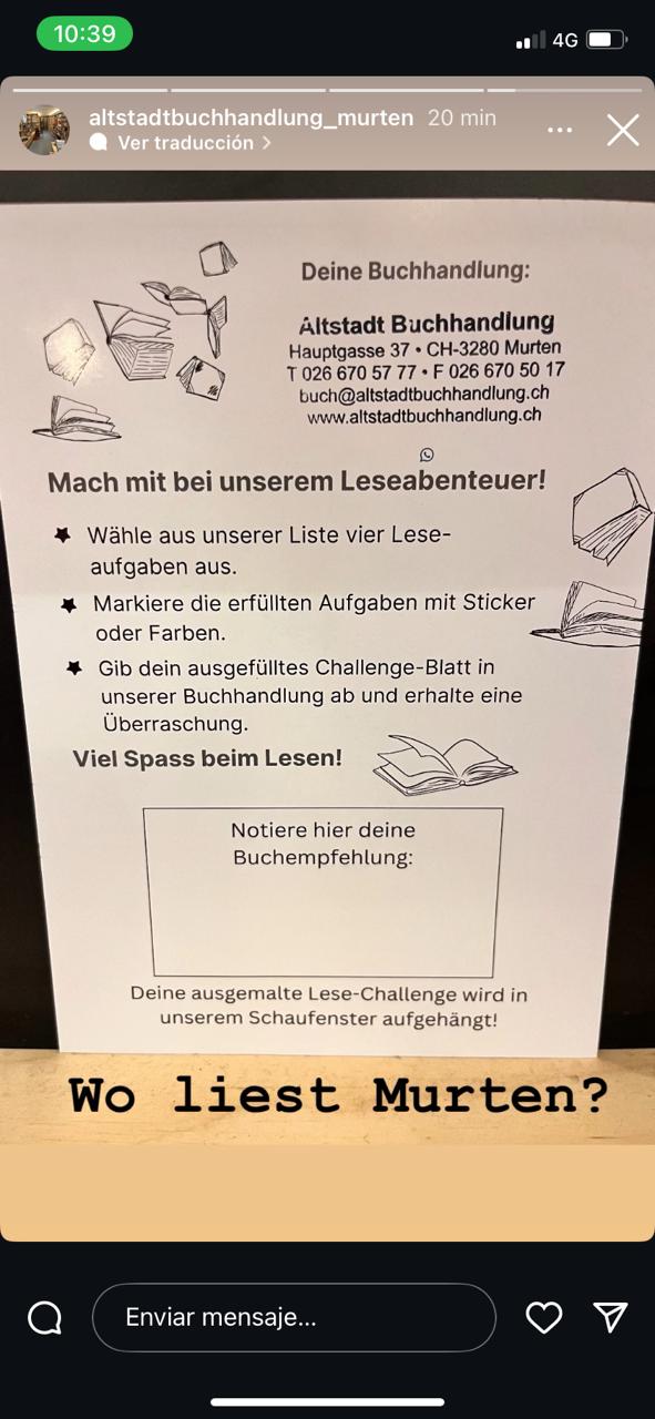 Mit einer originellen Lese-Challenge lädt die Altstadtbuchhandlung Murten und Buchhandlung „Die Gute Seite“ in Düdingen noch bis Ende August Leserinnen und Leser aller Altersgruppen dazu ein, neue Leseorte zu entdecken und ihre Freude am Lesen zu teilen.