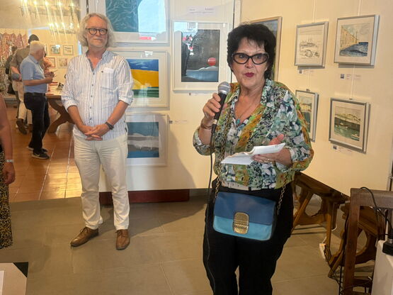 (Bildlegende: Alexander Schroeter, Gemeinderat, und Claire-Lise Chaignat, Organisatorin der Ausstellung.)