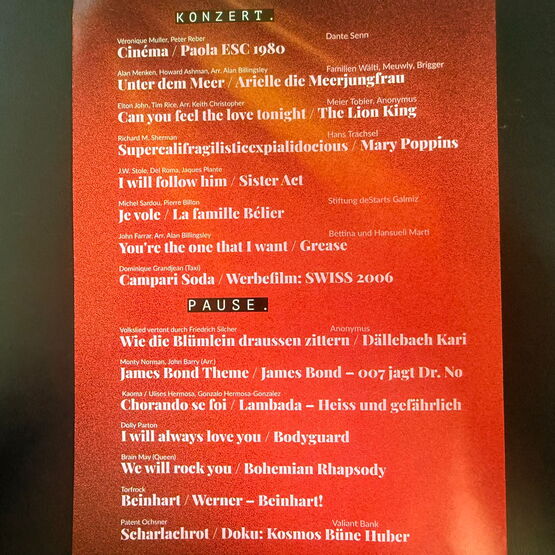 Das Publikum liess sich von Songs aus Filmklassikern wie The Lion King, Mary Poppins, James Bond, verzaubern; der bunte Musikstrauss war Oscarverdächtig! Wie am Filmset wird vor Beginn einer neuen Szene bzw. eines Songs mit der Filmklappe das Startsignal angekündigt. Während des Konzertes sorgten lustige, unterhaltsame Einlagen für gute Stimmung und Gelächter.