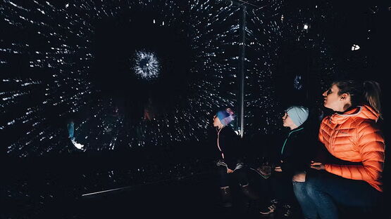 In einem Augenblick dehnte sich das Universum mit atemberaubender Geschwindigkeit aus. Materie und Energie verbanden sich zu Teilchen, zu Atomen, zu Sternen – der Ursprung von allem. Im Spiegelkubus wird diese Geschichte zu Licht. Wände verschwinden, Formen vervielfältigen sich und jeder Lichtfunke wird zum Echo.