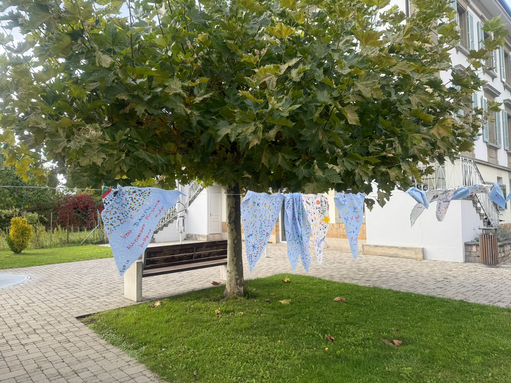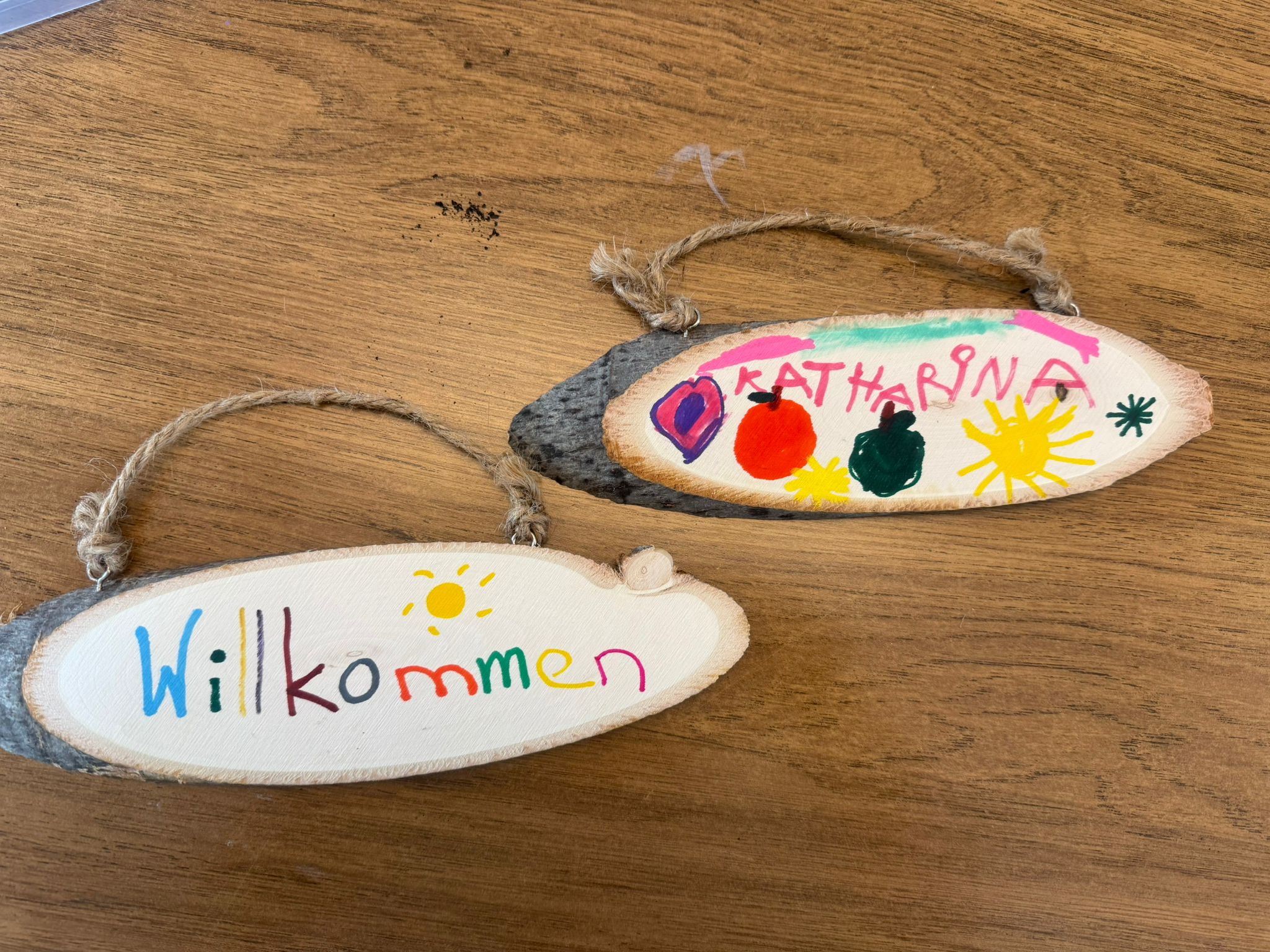 Ein Willkommensschild für die Eingang-oder Kinderzimmertür, Fähnchen für die gemeinsame Wäscheleine vor der Kirche als Zeichen der Zusammengehörigkeit.