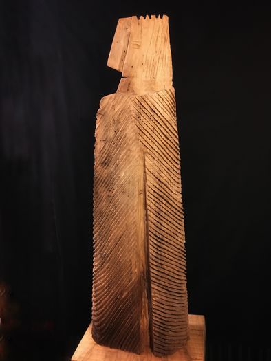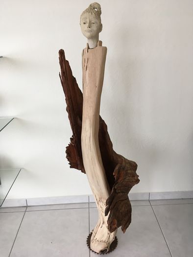Wenn er von seinen Skulpturen erzählt, ist ihm die Begeisterung anzusehen, er liebt es, zu entdecken, was sich im Holz zeigt und es ins rechte Licht zu rücken. Wie es in der Natur kreativer Köpfe liegt, versucht auch Frank gerne Neues, seit Kurzem arbeitet er mit der Kettensäge; es entstehen zackige Konturen, kantige Formen und zuweilen ziert ein fein gearbeitetes Tonköpfchen das Werk. Ich finde grossartig, entdeckten Frank und seine Partnerin ihr gestalterisches Geschick und es ist eine wunderbare Fügung, ergänzen sie sich darüber hinaus in ihrer Arbeit.