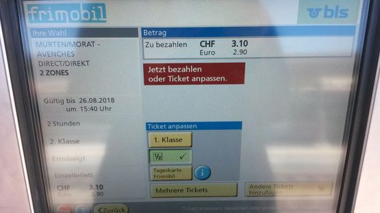 Sonntagnachmittag am Bahnhof Murten. Ist das Portemonnaie wegen des letzten teuren Urlaubs bald auf Sparflamme? Da muss ein Trick her, damit die Fahrt von Murten nach Pfauen (Faoug) nicht zu sehr auf die Geldbörse schlägt: Eine Fahrkarte Retour (hin und zurück) am BLS-Automaten nach Faoug kostet CHF 2.20 (1/2-Preis Abo/Halbtags), ist aber nur eine Stunde gültig. Diese Zeit reicht leider nicht, um nach dem Mittagessen im Restaurant- in Pfauen gleich am Bahnhof - noch einen Verdauungsspaziergang zum nahen Murtensee zu machen!
