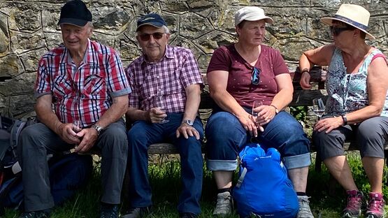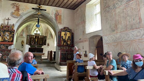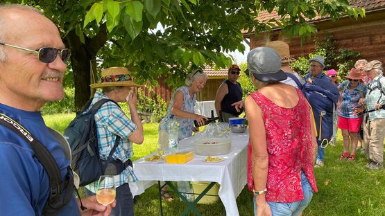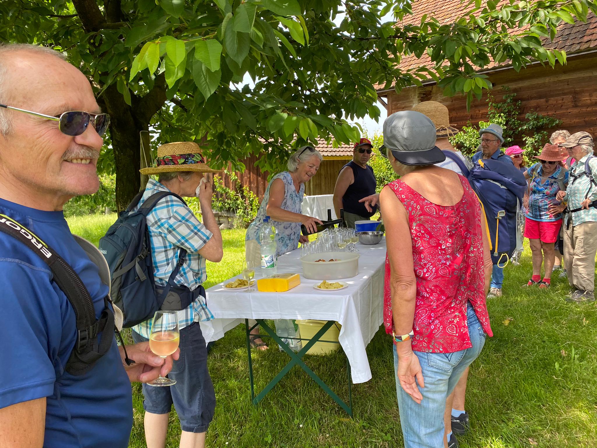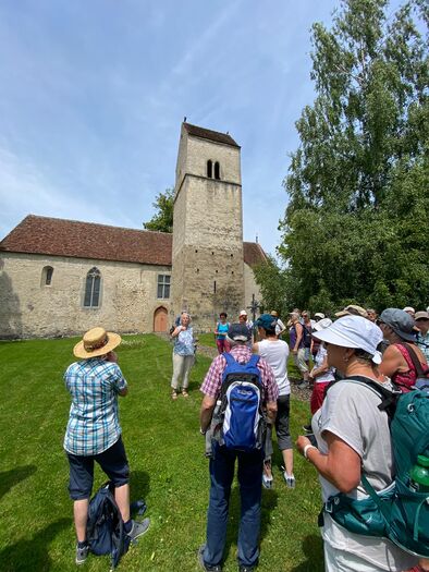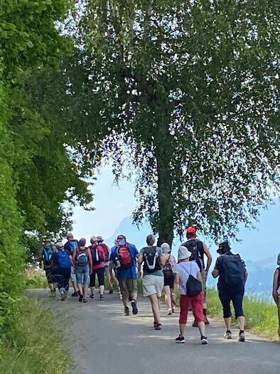 In Sursee nahmen wir unseren obligaten Startkaffee - da darf der Boxenstopp auch nicht fehlen. Von Schenkon aus wanderten wir auf dem alten Römerweg Richtung Süden mit Blick auf den Sempachersee. Monika erzählte uns, wie er trotz grossem Fischsterben 1984 wieder zu den fischreichsten Seen der Schweiz geworden ist. Via Eich-Neuhof gelangten wir zur ersten Überraschung. Vor der romanischen Kirche in Kirchbühl erwartete uns ein Apéro riche - natürlich gespendet! In der kühlen Kirche erfreute uns Wanderkollegin Stefanie, ehemalige Opernsängerin aus Wien, mit dem Lied "Die Kirschen aus Nachbars Garten".