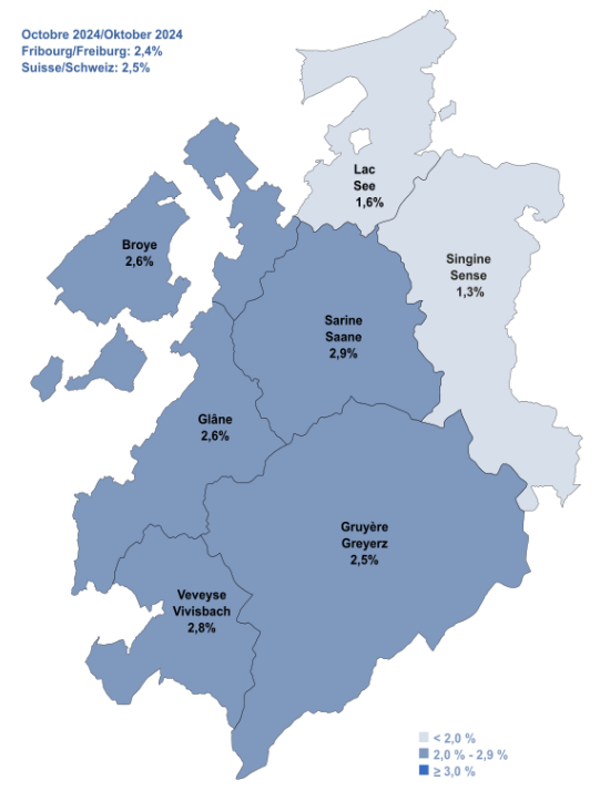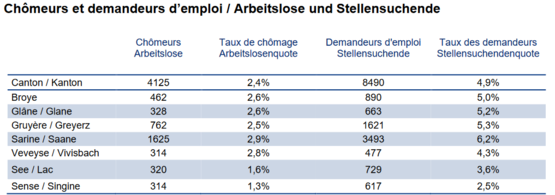 Im Saane- (2,9 %) und im Greyerzbezirk (2,5 %) blieb die Arbeitslosenquote unverändert. In vier Bezirken ist die Quote dagegen gestiegen, und zwar auf 2,6 Prozentpunkte im Glane- (+0,3 Prozentpunkte), auf 2,8 % im Vivisbach- (+0,2 Prozentpunkte), auf 1,3 % im Sense- (+0,1 Prozentpunkte) und auf 1,6 % im Seebezirk (+0,1 Prozentpunkt), während sie im Broyebezirk auf 2,6 % gesunken ist (-0,2 Prozentpunkte). Im Landesdurchschnitt blieb die Arbeitslosenquote unverändert bei 2,5 %.