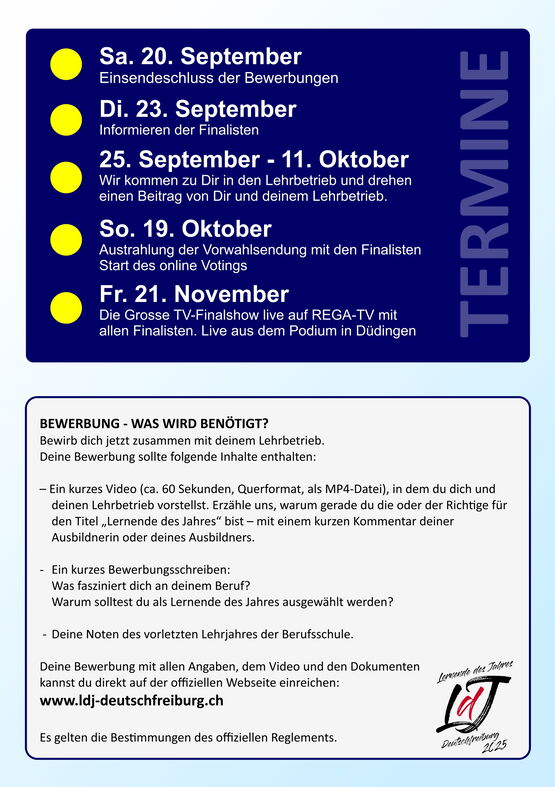 Bis am 20. September 2025 können Lernende aus dem deutschsprachigen Teil des Kantons ihre Bewerbung einreichen. Als Preisgeld für den Gewinner, die Gewinnerin winken 5000 Franken.