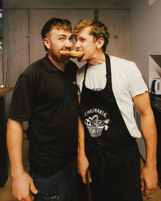 Tobias Boschung (links) ist einer von mehreren engagierten Mitarbeitern von Coolinarik und unterstützt Lukas Lauber (rechts) nicht nur bei Workshops, sondern auch bei der Vorbereitung von Caterings wie hier in Tafers.
