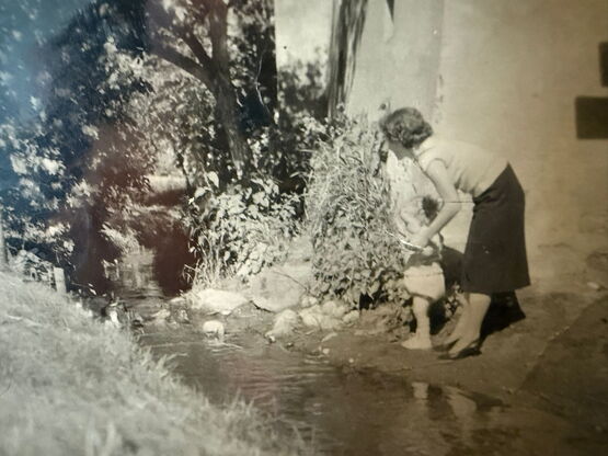 Bildlegende: Der Bach verlief hinter dem Hugelihuus. Martha, Schwester von Jakob, mit ihrem Sohn.