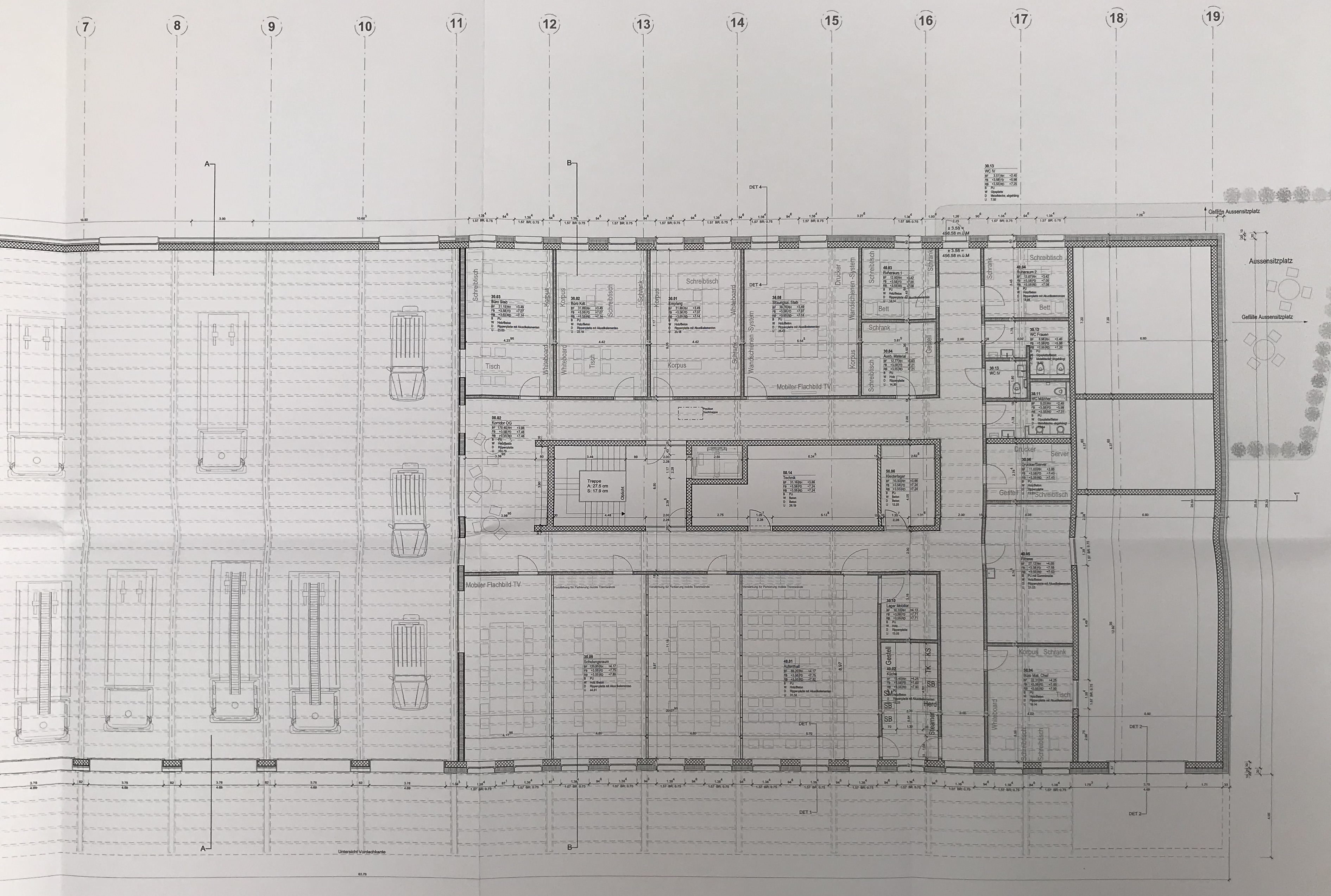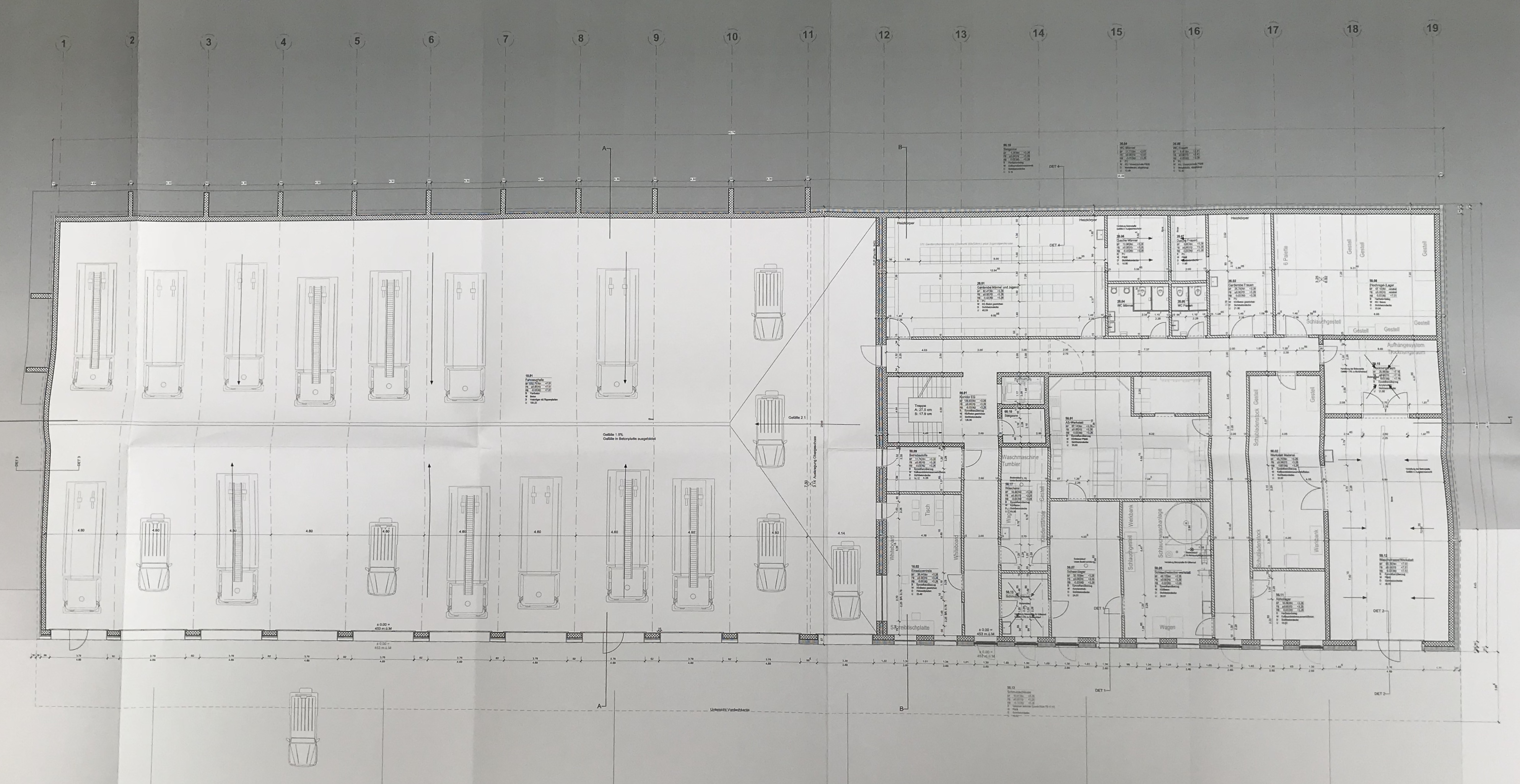 Das neue Zentrum an der Hanglage wird aus zwei Teilen bestehen: Der Fahrzeughalle, welche Platz für 22 Fahrzeuge bieten wird und dem zweigeschossigen, nach Minergie-Standards geplanten Personaltrakt. Im Obergeschoss des Gebäudes befinden sich Büros, Sitzungszimmer und diverse andere Räumlichkeiten, wie beispielsweise ein Fitness- und Pausenraum.