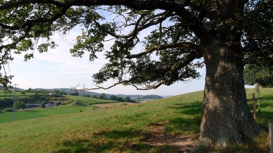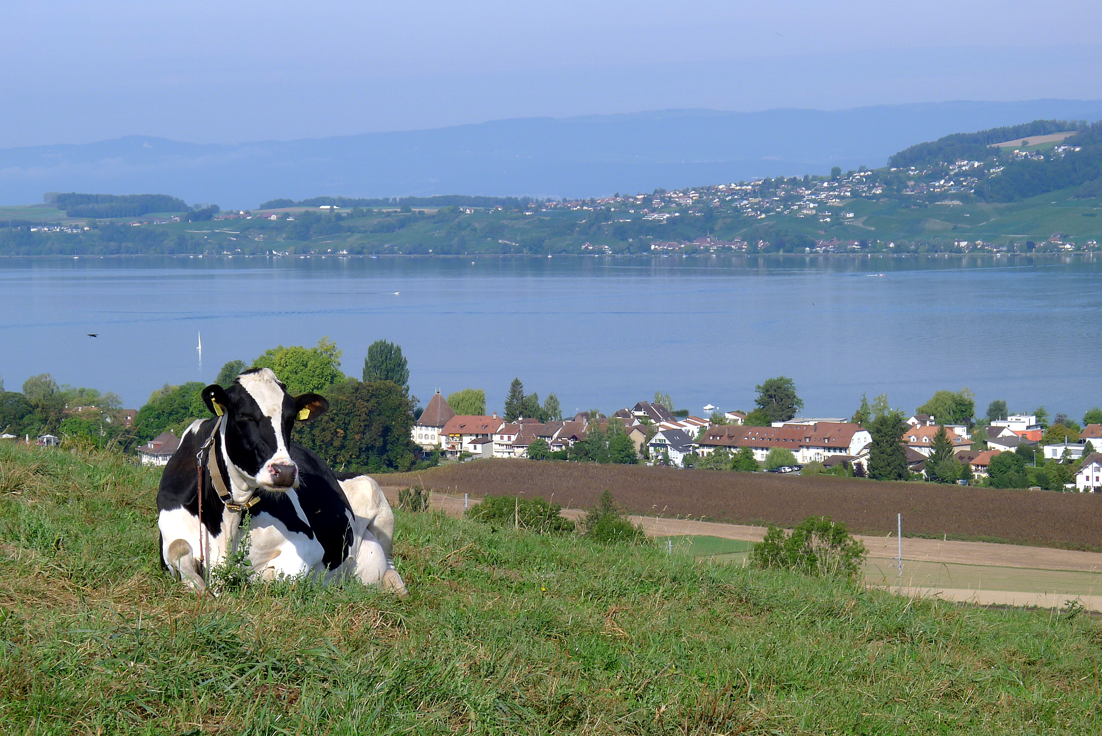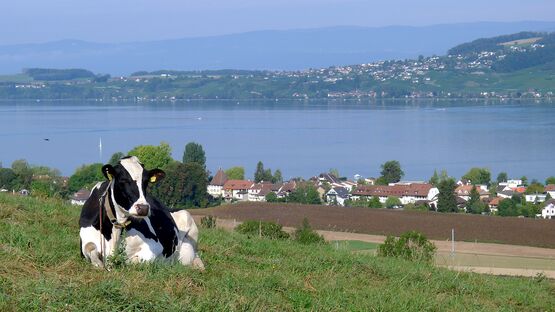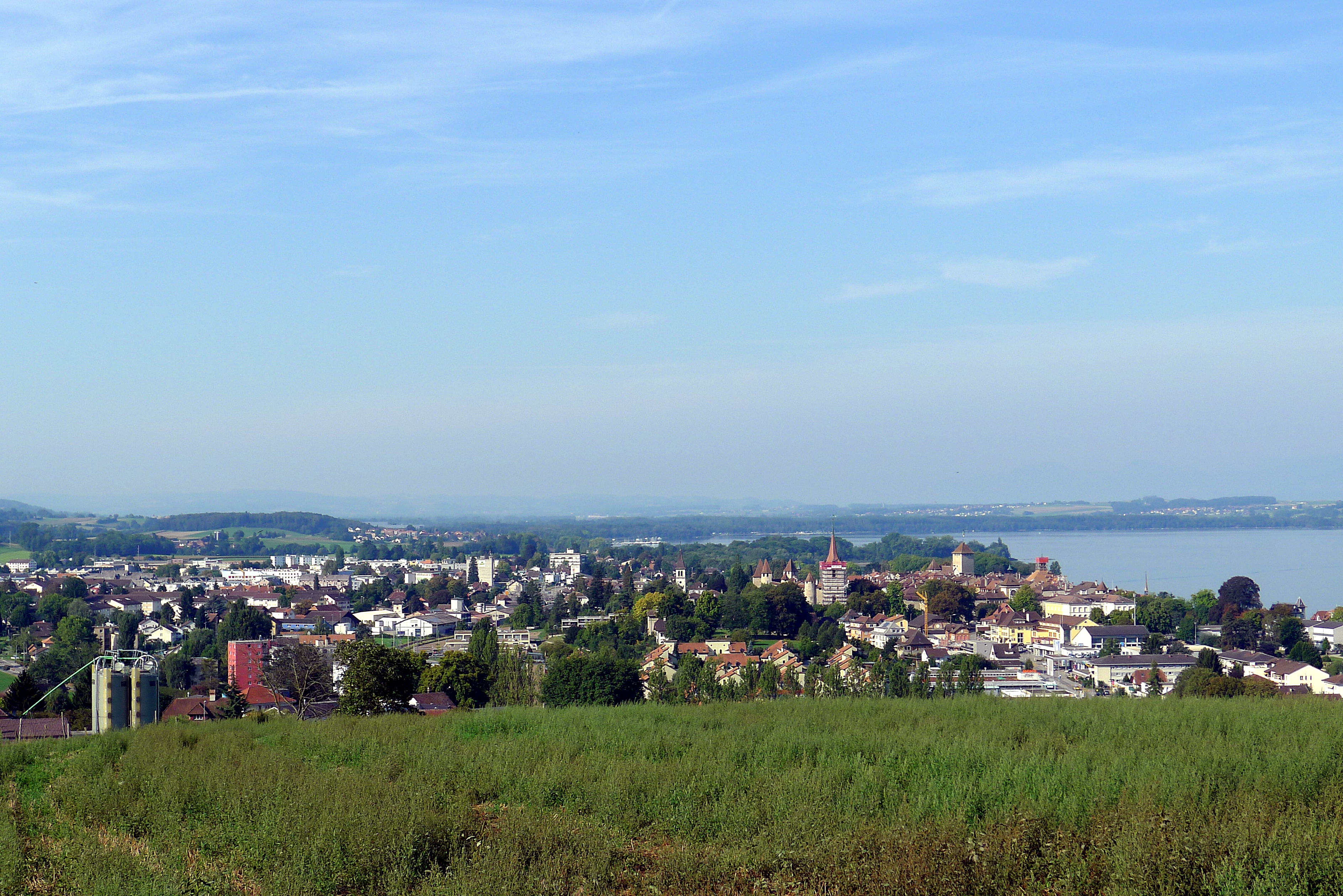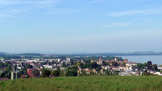 Hier geniesst man wahrlich eine fantastische Aussicht: Im Süd-Westen Avenches, im Nord-Nord-Westen der Chasseral, der Murtensee im Westen - und natürlich Muntelier und Murten im Westen. Auch das Spital HFR Meyriez ist sehr gut zu sehen.