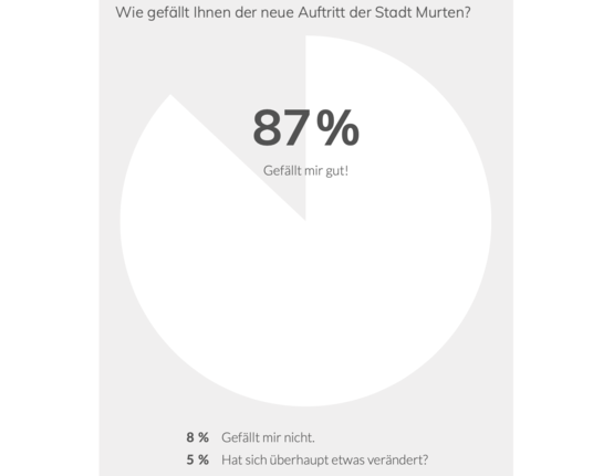 Wir haben unsere Leser daraufhin gefragt, wie ihnen der neue Auftritt gefällt. Das Resultat der Umfrage hätte nicht klarer ausfallen können: ganze 87% gaben an, dass ihnen das neue Corporate Design gut gefällt. 5% sahen keine Veränderung zum vorherigen Auftritt und nur 8% meinten, dass ihnen das Design nicht gefällt. Die hohe Zustimmung der Bevölkerung zeigt, dass die Stadt Murten bei der Gestaltung, die in Form eines Workshops stattfand, gute Arbeit geleistet hat.