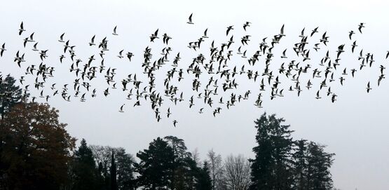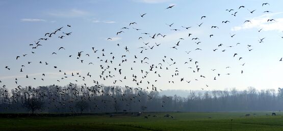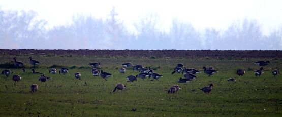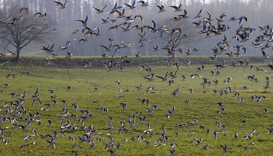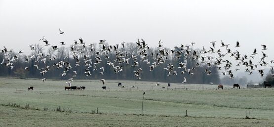 Graugänse und Möwen stürmen die Wiesen in Greng