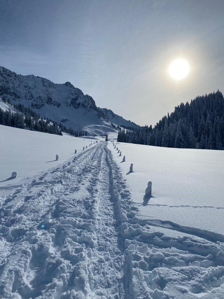Bergauf wandern, bis einem richtig warm ist, dem Knirschen der Schritte lauschen oder bloss der Stille. Die verschneiten Tannen bestaunen, irgendwo ein Plätzchen freischaufeln, das Gesicht der Sonne entgegenstrecken und den mitgebrachten heissen Tee schlürfen.