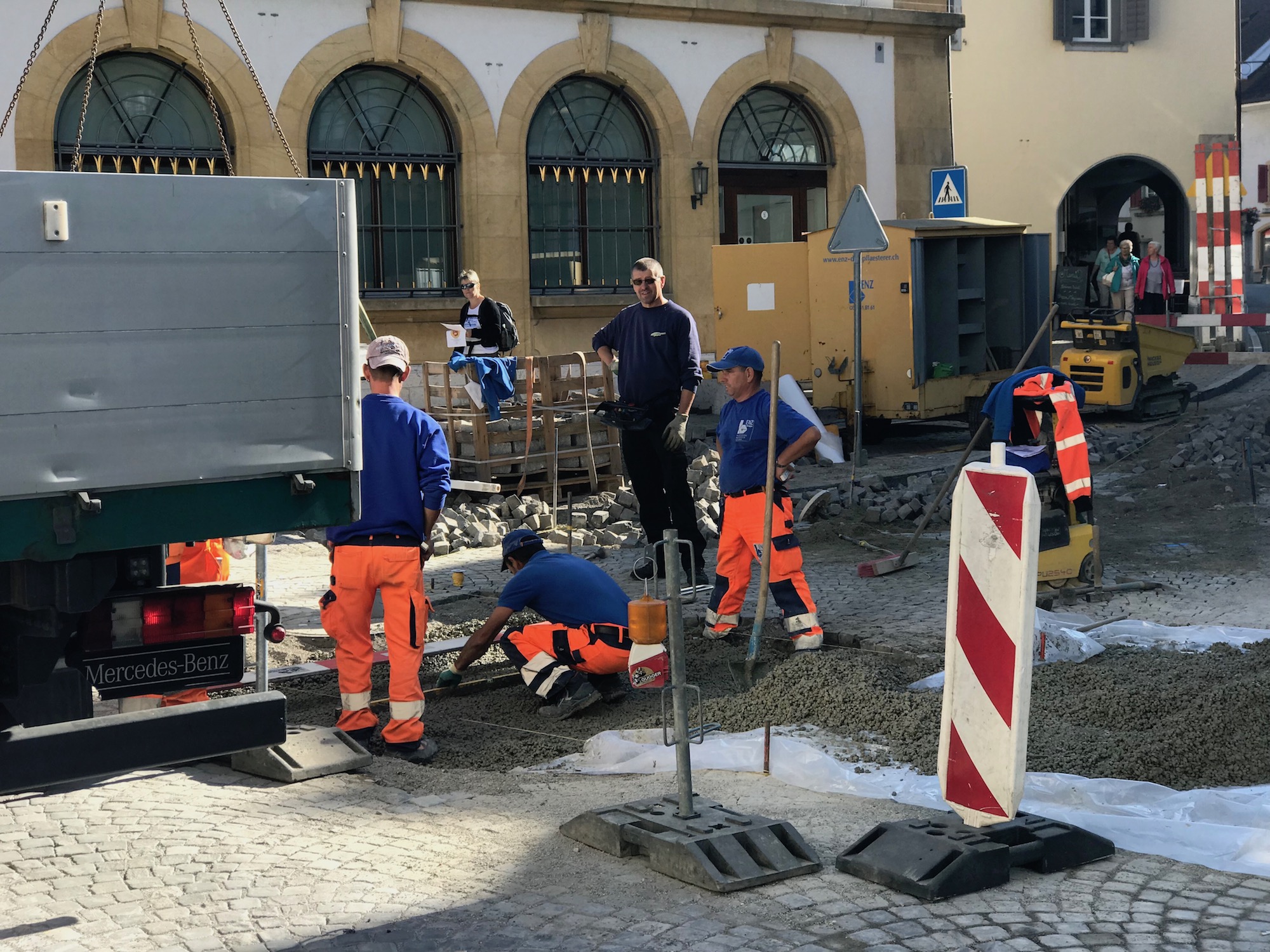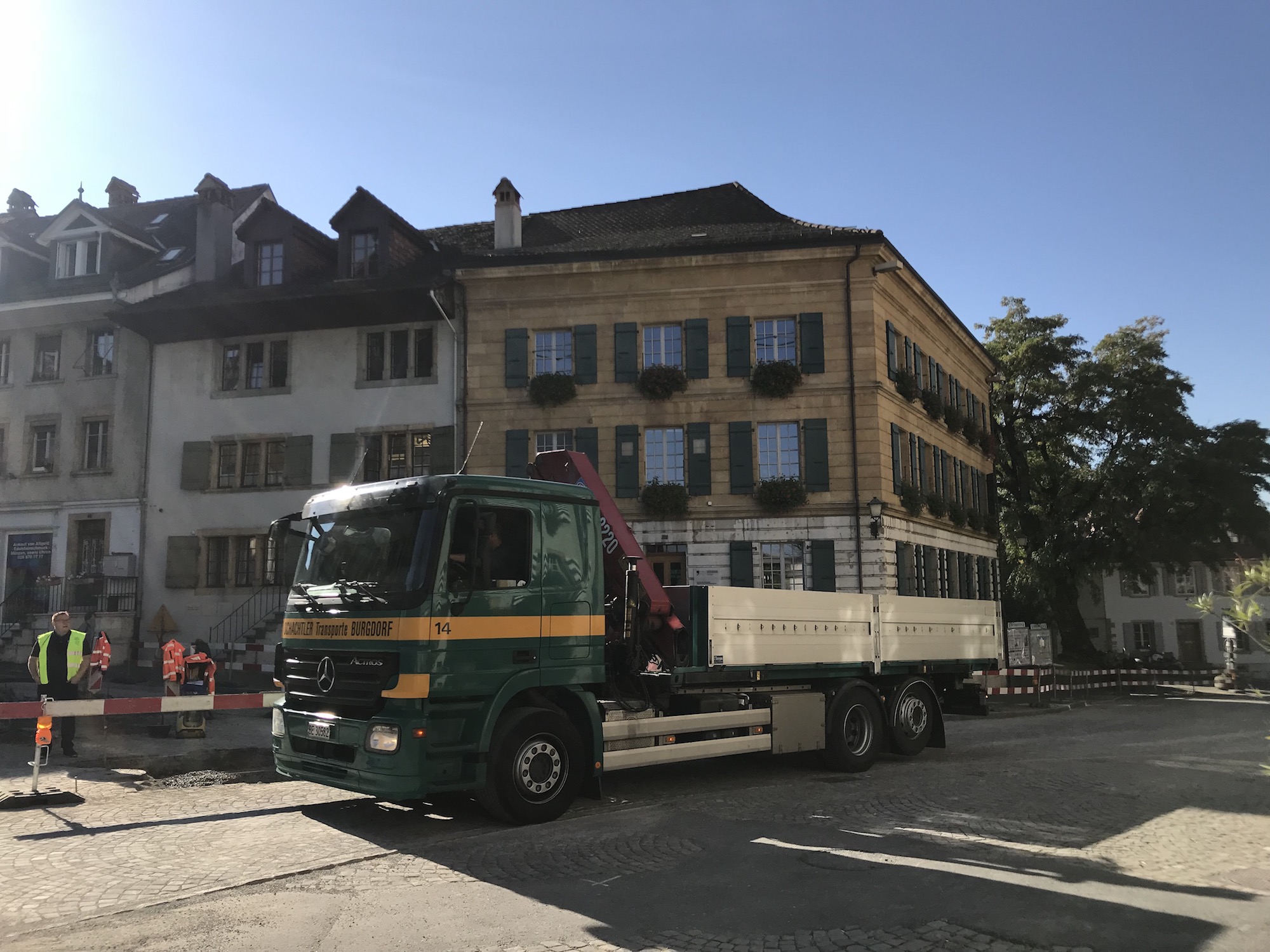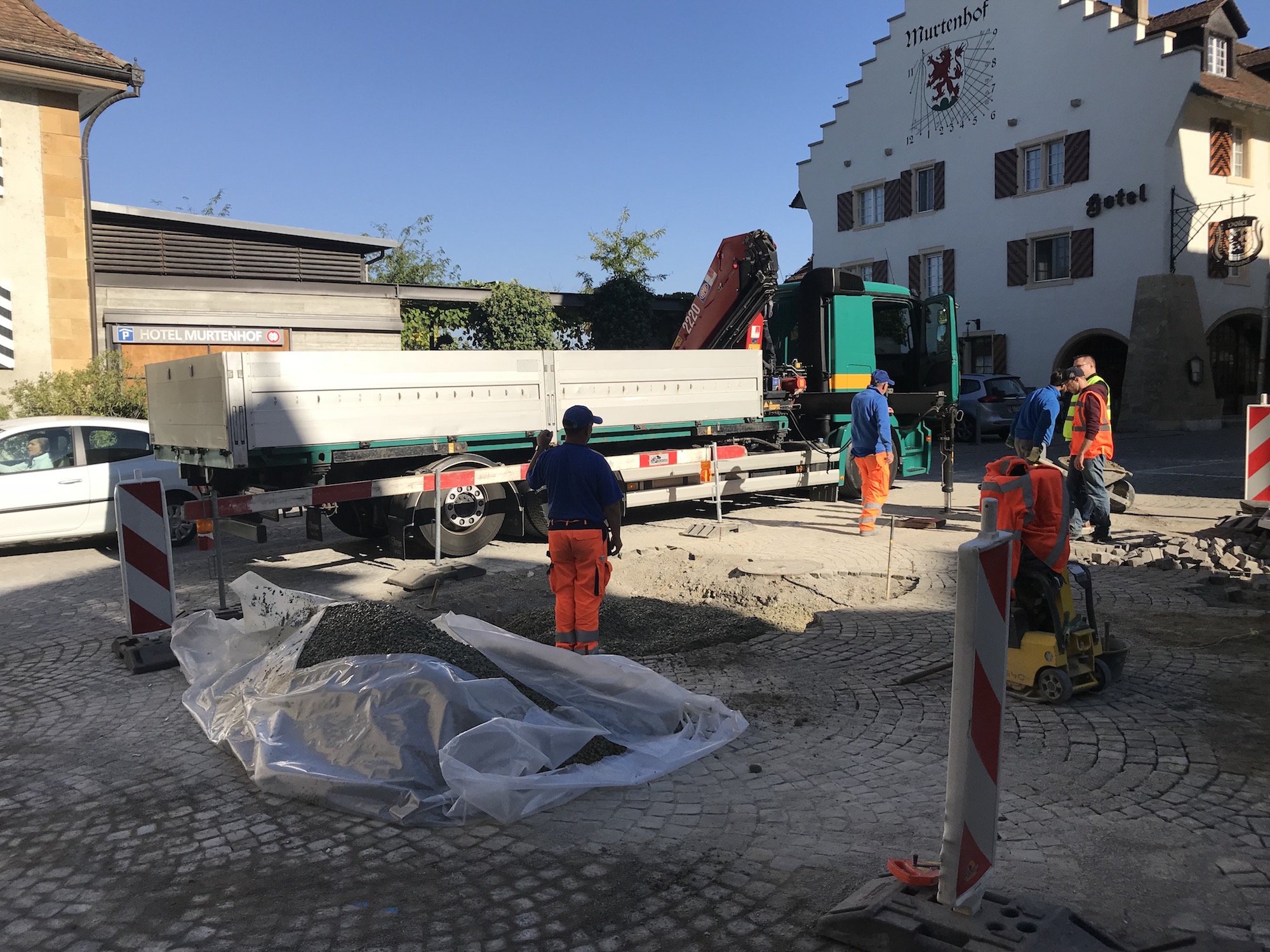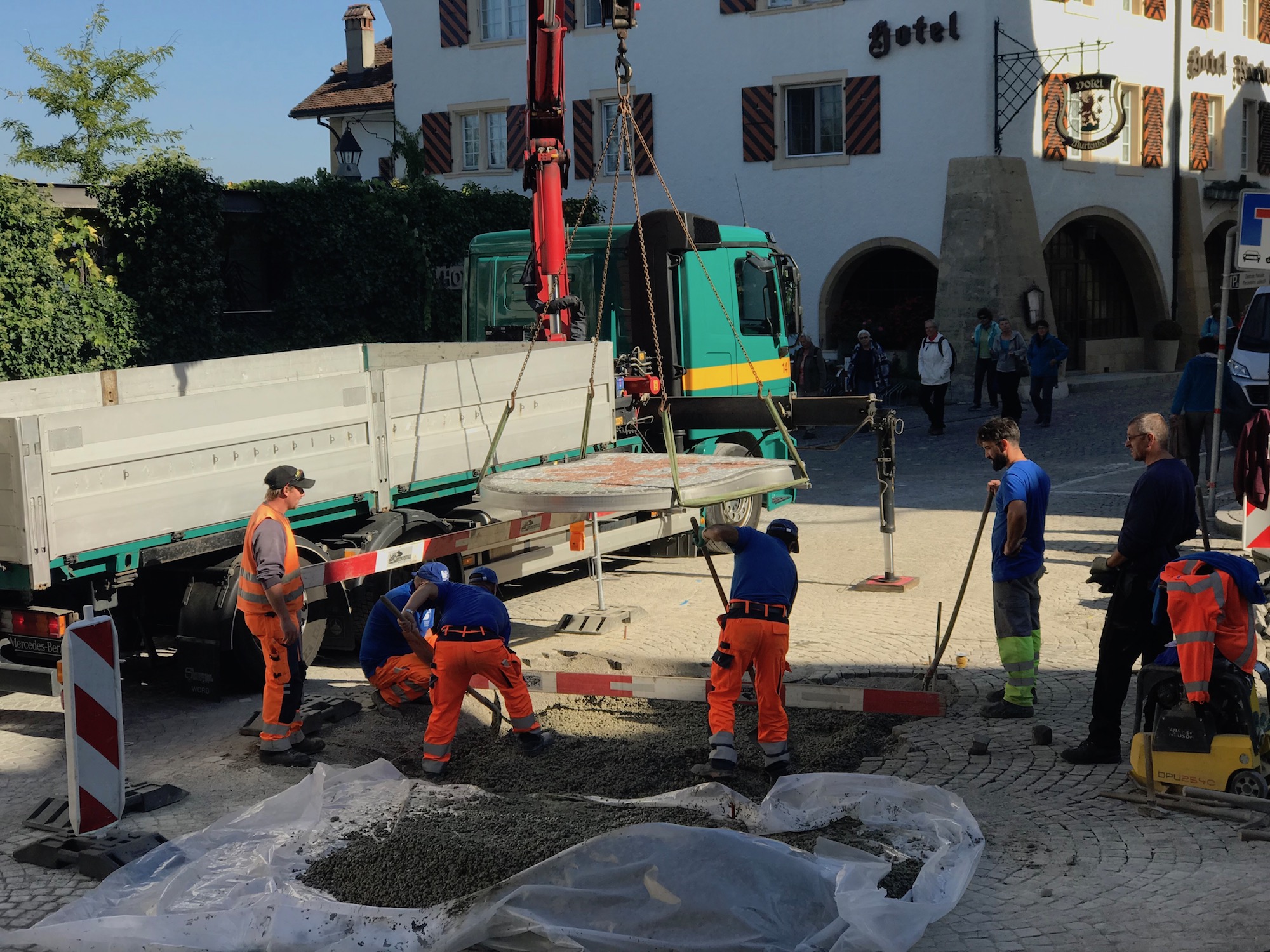 Ab heute prangt der Murtenleu, dargestellt durch gefärbe Pflastersteine, im Boden zwischen dem Polizeiposten und der Valiant-Filiale. Das Einsetzen des schweren Stücks ist schwieriger gewesen, als erwartet. Die Strassenarbeiter mussten mehrmals das Fundament unter dem Logo neu ebnen, damit es am Ende richtig sitzt und gut aussieht.