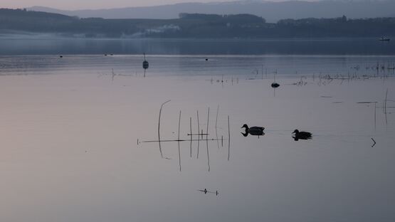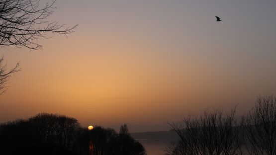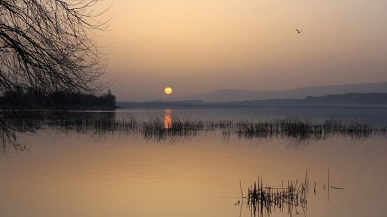 Ein Wärmeschub von Süden macht das Wetter in Murten um die Mittagszeit und seit Ende Januar mit angenehm gefühlten knapp 20°C recht warm. Nur zwischen dem 10. und dem 15. Februar waren die Nächte knapp unter null Grad. Die Süd- und Südwestwinde verfrachteten auch in den letzten Tagen viel Saharastaub nach Mitteleuropa. Dieser feine Sand legte sich wie ein Filter zwischen Sonne und Betrachter und tauchte das Sonnenlicht auch am Morgen in ein besonderes Licht. Vor allem am Abend können wir deshalb am Murtensee Sonnenuntergänge mit besonderen Farben beobachten.