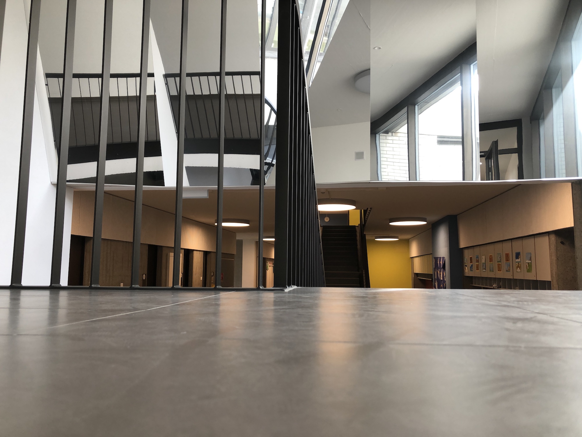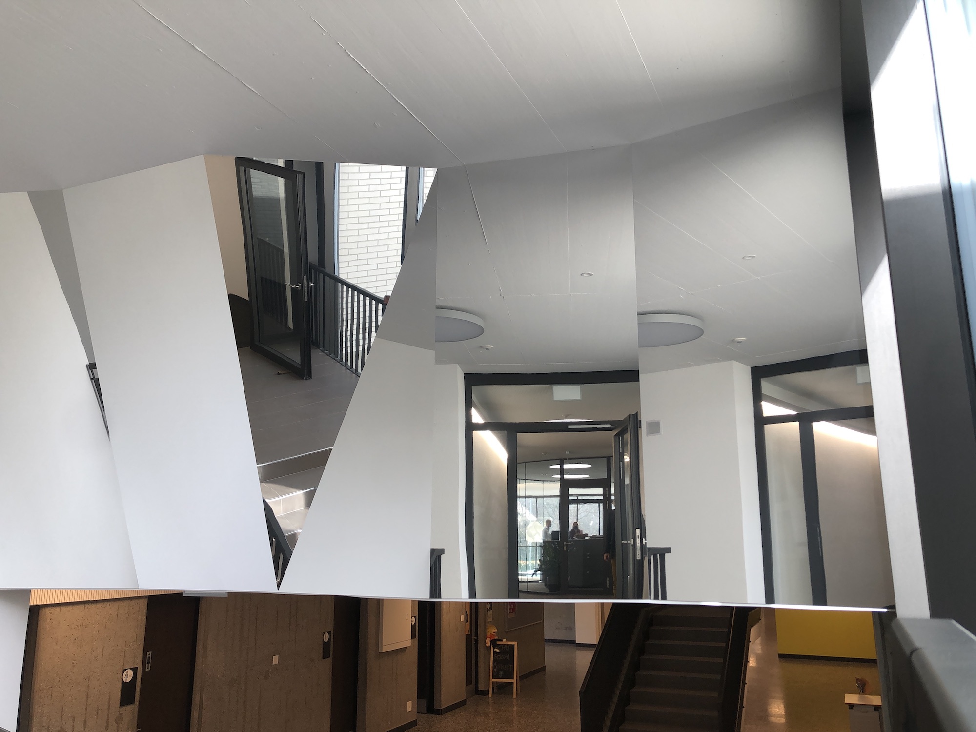 In Murten - genauer im Primarschulhaus Längmatt - hängt seit Februar ein neuer Spiegel. Dabei geht es aber nicht einfach um einen alltäglichen Garderoben-Spiegel, sondern um eine knapp 10 m2 grosse, mehrfach gebrochene Spiegelfläche. Das Faszinierende: Die Installation bringt aussen nach innen, verschluckt einem, oder rückt einem zu jemandem hin, neben dem man gar nicht geht oder steht.