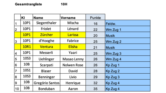 Bei den jüngeren Kadetten der 10H, die unter sich die Titel der Unteroffiziere ausmachten, holte sich mit Mischa Siegenthaler ebenfalls ein Jeusser den ersten Rang. Er wird an der Soli als Feldwebel im Korps wirken.