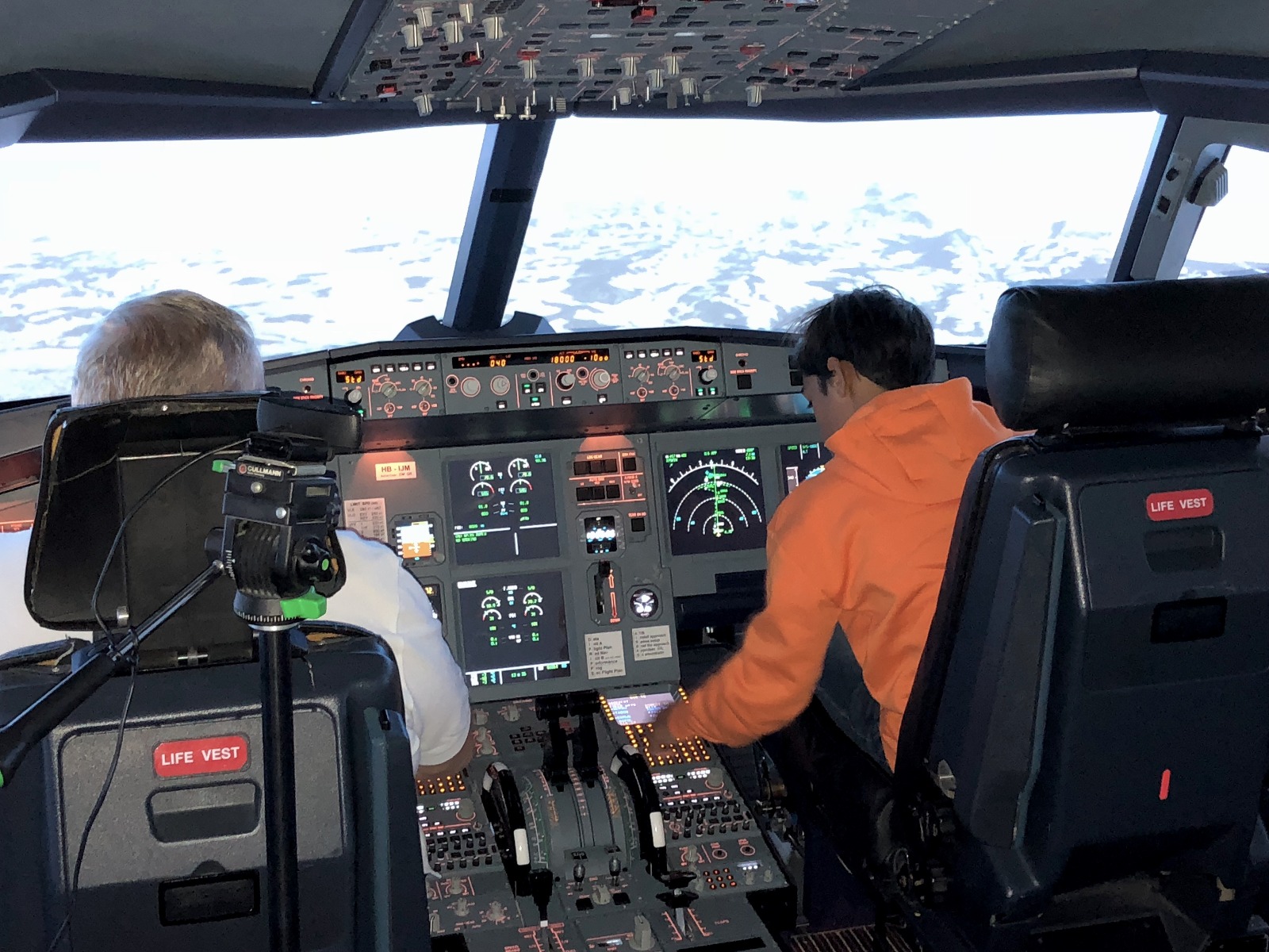 Die Einführung ist gemacht. «Seat-Belt-Sign einschalten», fordert Kapitän Urs Staub seine Kopiloten auf. «Cabine crew close and arm doors”, gibt er an die Kabine durch und zeigt wie seine Schüler den Türstatus überprüfen können. Livio löst die Parkbremse und startet während dem Pushback das erste und dann das zweite Triebwerk. Langsam rollt der Airbus Richtung Runway 28. «Zurich Tower, SWR 123 ready for departure”. Der Tower in Zürich meldet Startfreigabe: « Swiss 123, wind is calm, Runway 28 cleared for takeoff». Dann heulen die Triebwerke auf und das Flugzeug beschleunigt. «80 Knoten, 100 Knoten, 140 Knoten, rotate, ziehen, ziehen, rauf mit der Nase, sehr gut, Fahrwerk einziehen», instruiert Urs Staub seine jungen Kollegen neben ihm mit klarer und bestimmter Stimme. Livio hat den «Vogel» problemlos in die Höhe gebracht, schaltet wie ein erfahrener Pilot nach dem Startmanöver den Autopiloten ein und gibt auf Anweisung seines Fluglehrers noch die angestrebte Flughöhe von 19000 Fuss, sowie ein paar weitere Flugangaben auf den verschiedenen Systemen ein. Jetzt bleibt Zeit, kurz einen Blick auf den Zugersee und die Rigi zu werfen, die links vorbeihuschen. Über dem Murtensee drehen wir dann entgegen des ansonsten getreu geflogenen Kurses von Zürich nach Genf doch noch schnell eine 360 Grad Kurve, was die Piloten jedoch ziemlich fordert, da es gilt, sowohl die Drehung, wie auch die Flughöhe in Balance zu halten. «Sehr gut, Du machst das schon fast wie ein richtiger Pilot», lobt Urs Staub Livio, der nun aber kurz darauf den Sinkflug Richtung Flughafen Genf einleiten muss, um fünfzehn Minuten später die Maschine ruhig auf der Piste 22 aufzusetzen. «Das war mega cool», lautet das Fazit von Livio, nachdem er stolz und erfreut über die gelungene Landung das Steuer an Juliano abgibt. Nun ist es an ihm und später an Joel, die Passagiere wieder heil nach Zürich zu bringen. Es ist an den Gesichtern der drei Jungs abzulesen, dass sie dieses besondere Erlebnis nicht so schnell vergessen werden.