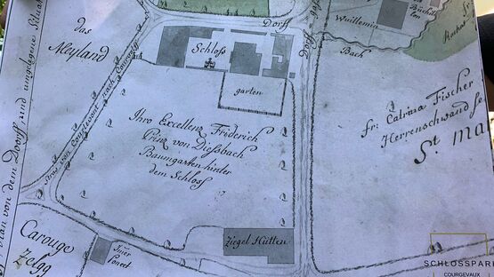 Dieser Plan von 1730 wurde zur damaligen Zeit, als es noch keine Geometer gab, im Auftrag der Kirche, welche Ländereien als Schenkungen erhielt, und mit damals üblichen Vermessungstechniken erstellt. Die eingetragenen Strassen entsprechen denen von heute, mit minimalen Abweichungen. Das Manoir wurde fast zur gleichen Zeit gebaut wie die Ziegelei und die Scheune. Zu einem späteren Zeitpunkt, im Jahr 1792, wurde das Herrenhaus im Auftrag von Francois Pierre de Diessbach vom Freiburger Architekten de Castella vergrössert.