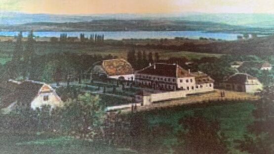 Auf dem vom freiburgischen Maler Joseph von Landerset gemalten Bild sieht man links vom Manoir die grosse Scheune, die 1935 abbrannte, vorne links ist die Ziegelei mit Trocknungshalle zu sehen.