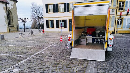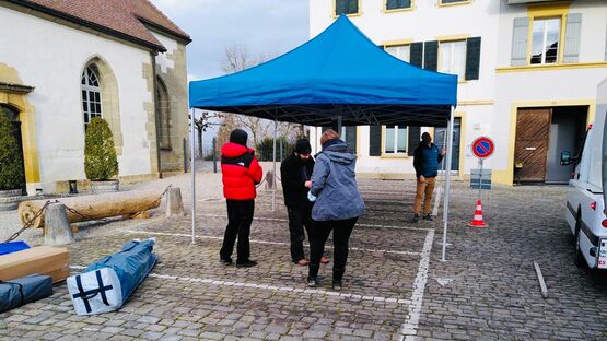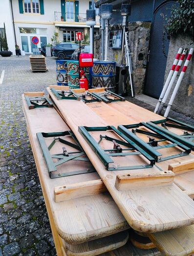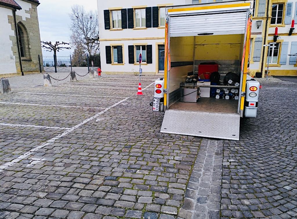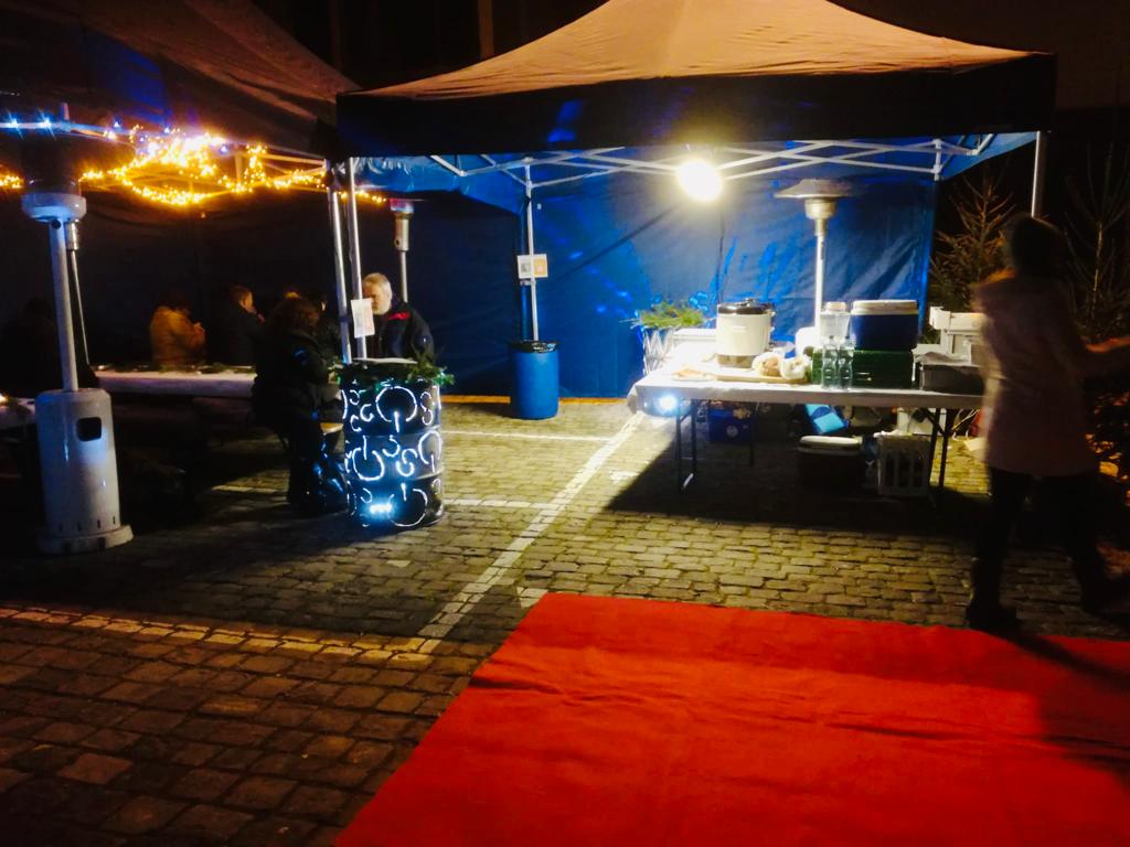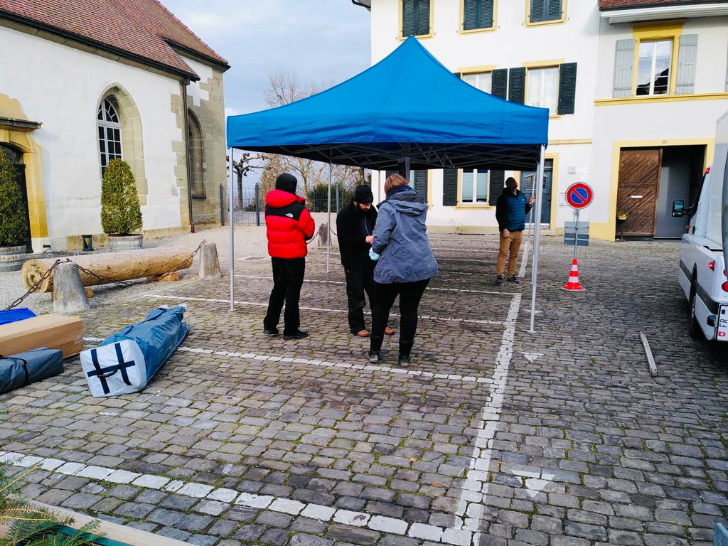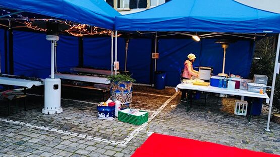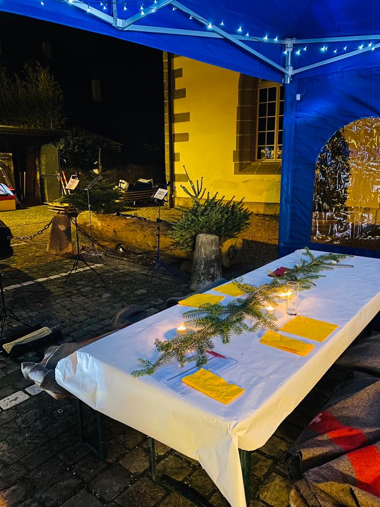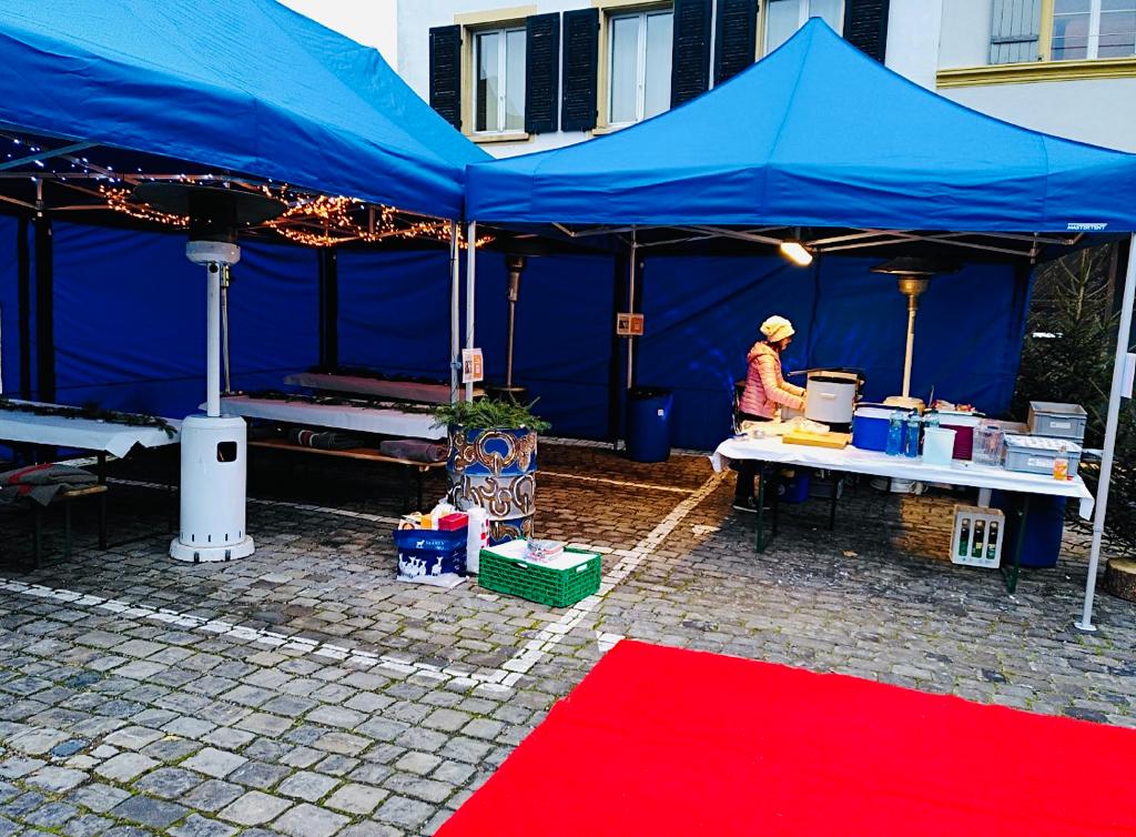Nachmittags um 13.30 Uhr wurde mit dem Aufbau begonnen. Der Werkhof stellte Tische und ein nützliches Transportfahrzeug zur Verfügung. Die Tische wurden schön geschmückt; dank Heizungslampen konnte das Essen später in der Wärme genossen werden. Der Stand und die Tische waren zudem überdacht. Ab 18 Uhr konnten dann eine sehr leckere Gemüsesuppe, Brot, Käsekuchen, verschiedene Getränke, «Nidlechueche» und Panettone bezogen werden. Umsonst. «Wiviu schuldeni öich?», wurde ich ein paar Male gefragt. Es war eine sehr schöne Erfahrung, sagen zu dürfen: «Nüt. Es isch aues gratis. Löts öich la schmöcke – u dir chöit gärn cho nachehole.»