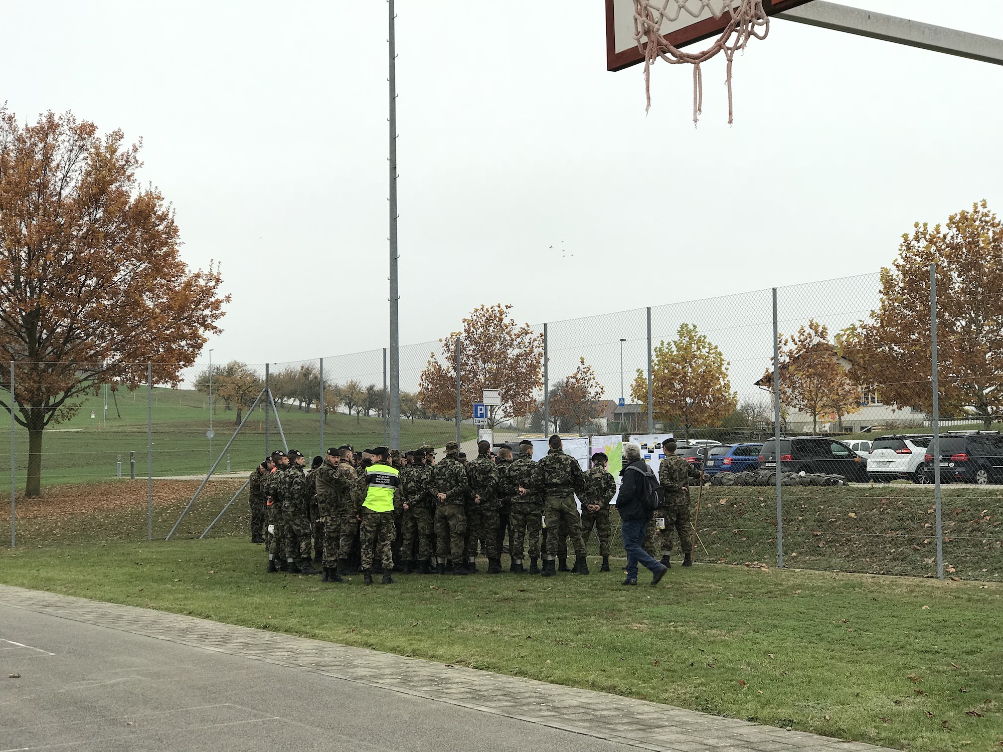 Der Hintergrund ist kein Ernstfall, sondern der Abschluss einer zehntägigen Durchhalteübung der Panzer- und Artillerie Offiziersschule. Nachdem die Offiziersaspiranten den gestrigen Tag mit einer langen Ausbildung im Häuserkampf in Le-Day (VD) verbrachten, wurden sie heute morgen per Lufttransport nach Murten befördert. Nun steht den Offiziersaspiranten noch der 100km-Marsch bevor. Nach knapp zweistündiger Vorbereitung marschierten sie um 12 Uhr los in Richtung Kaserne Thun, wo die Panzertruppen stationiert sind.