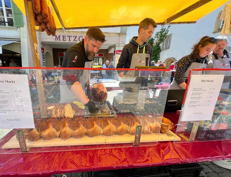 Ein wahres Highlight waren die 'Versucherli', auf diese musste lange verzichtet werden. Aber endlich darf wieder degustiert werden: Ein Stückchen Käse, ein Brothäppchen mit Honig bestrichenen, eine Olive oder ein Caramel. Apropos Caramel. Es hatte auffallend viele Stände, die Caramel-Produkte feilboten. Nebst den klassischen Nidletäfeli, gab es solche, die mit Salzen, Kräutern, Kaffee, Nüssen oder Spirituosen verfeinert werden, kompakt, brösmelig oder gar zähflüssig. Ein Fest für den Gaumen! Für das kulinarische Wohl war bestens gesorgt. Das Grillrad war in Betrieb, beim Betrachten eines meterlangen (nicht übertrieben!) Zopfs lief einem das Wasser im Mund zusammen. Es gab Knoblibrot, chinesische Nudeln, Crêpes und Zuckerwatte, Hotdog und natürlich Nidlekuchen.