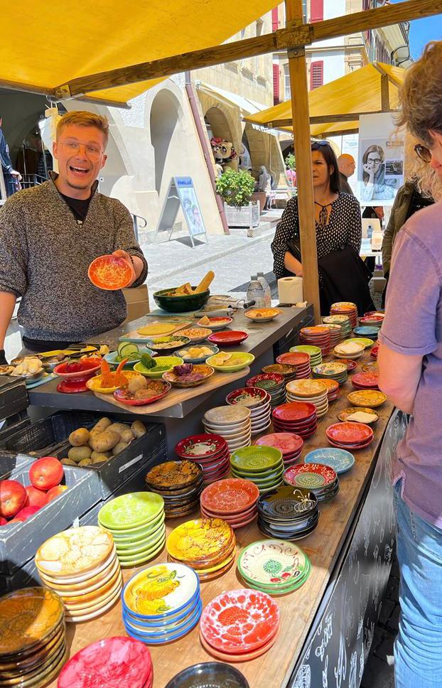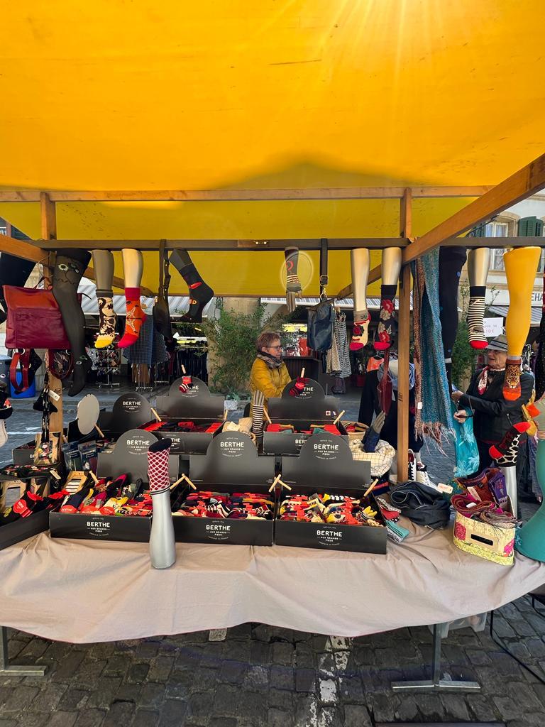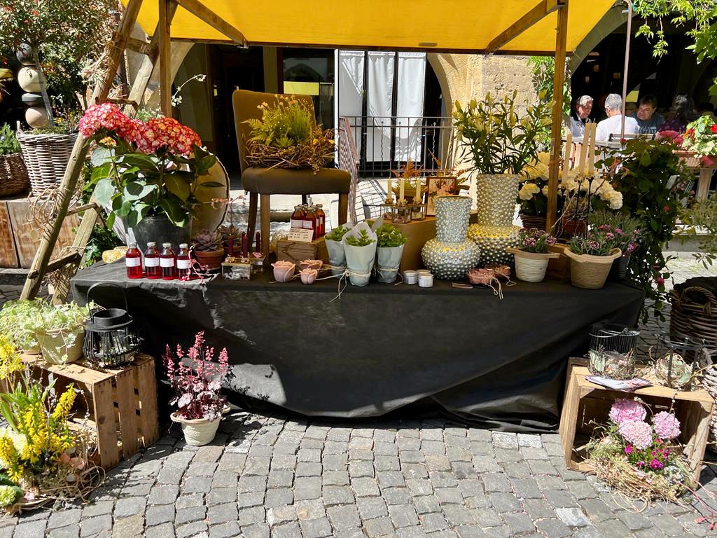Es lockten viele hübsch hergerichtete Stände, die keine 'Massenware' anboten. Handwerk und Kreativität sind gefragt; seien es kunstvoll gefertigte 3D-Karten, Blumengestecke, handgefertigter Schmuck oder Keramik, Genähtes, oder Holzarbeiten. Man trifft auf Händler, die man von Vorjahren kennt, nach anderen hält man vergeblich Ausschau und dann einige sind zum ersten Mal in Murten mit dabei. Ein junger Mann pries den schlichten Keramiker-Raffel-Teller an, eine Dame verkaufte originelle Socken und Strümpfe, von einem anderen Tisch her wehte der Duft exklusiven Kaffees, ein Mann lockte mit Flötenklängen.