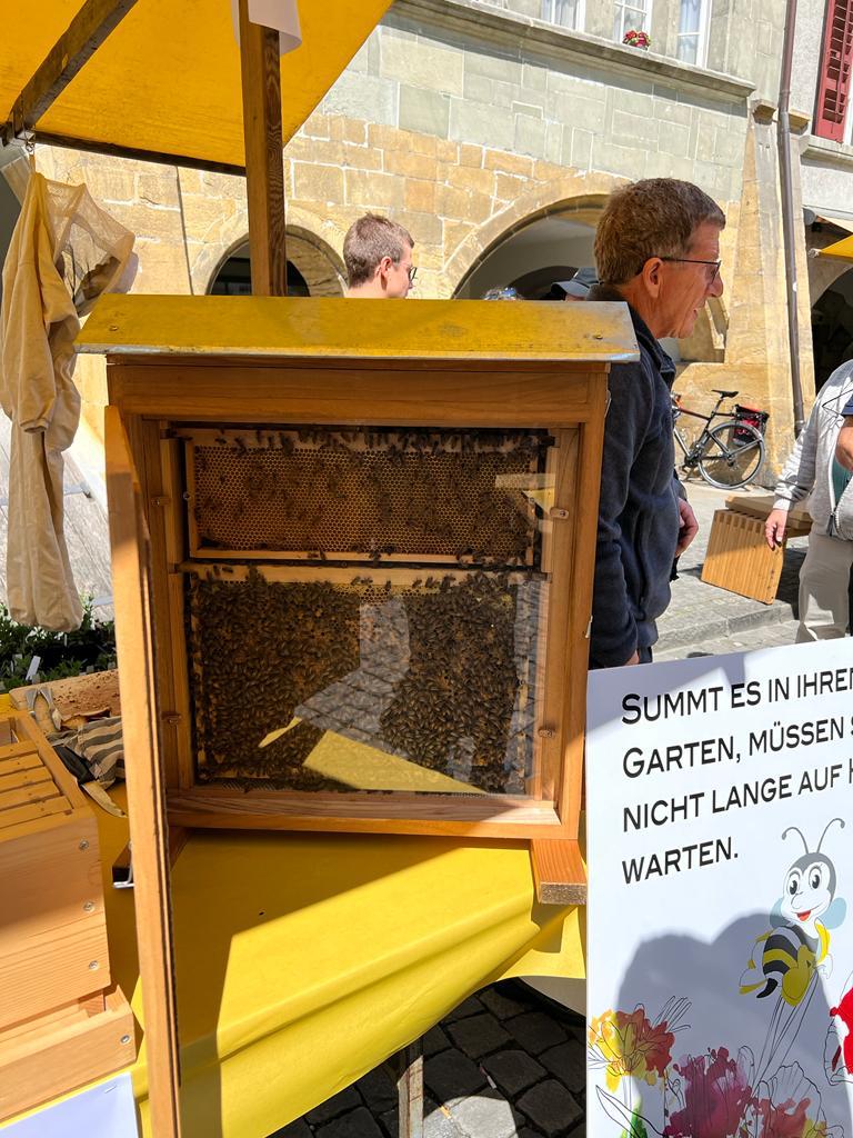 Bei den Imkern gab es für einmal keinen Honig zu kaufen, das letzte Jahr war wetterbedingt sehr schlecht gewesen. Stattdessen boten sie Pflanzen für Balkon und Garten an, natürlich solche, die Bienen gut nähren. Sie liessen keine Frage rund um Bienen und Honig unbeantwortet und ein Bienenvolk samt Königin durfte beim eifrigen Arbeiten beobachtet werden, sicher geschützt hinter einer Plexiglasscheibe.